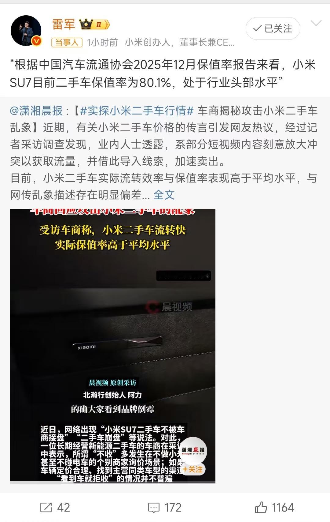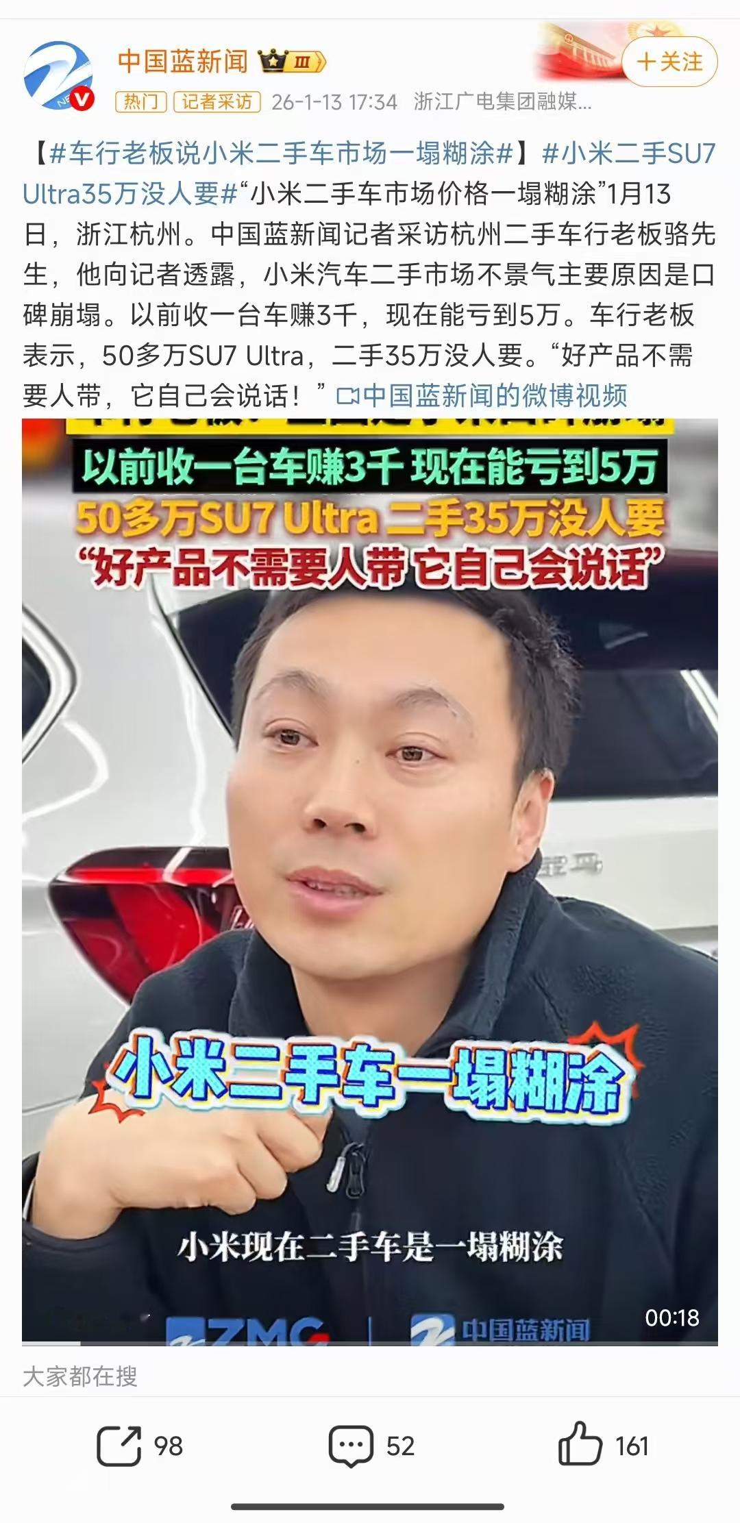 雷总回应小米二手车价格大跳水:保值率第二。雷总说的对,不用实地去考察,所有说我们不好的都是黑子,二手车市场真实的统计数据没有延迟也不需要过程,就信那个保值率就完了……事实是很多二手车商现在是砸手里了,以之前的市场行情价没人要,比如很多车商手里的SU7ultra二手车价格骨折都没人要,你看这个去采访的车商是怎么说的,行情价没用,因为没人买,有价无市,所以如果你统计行情价事实上是徒劳,要想卖出去得以实际的价格为准,问题是实际的成交价需要一个过程才能从行情价掉下来,所以等等看吧,时间会给大家答案......【来自懂车帝车友圈】