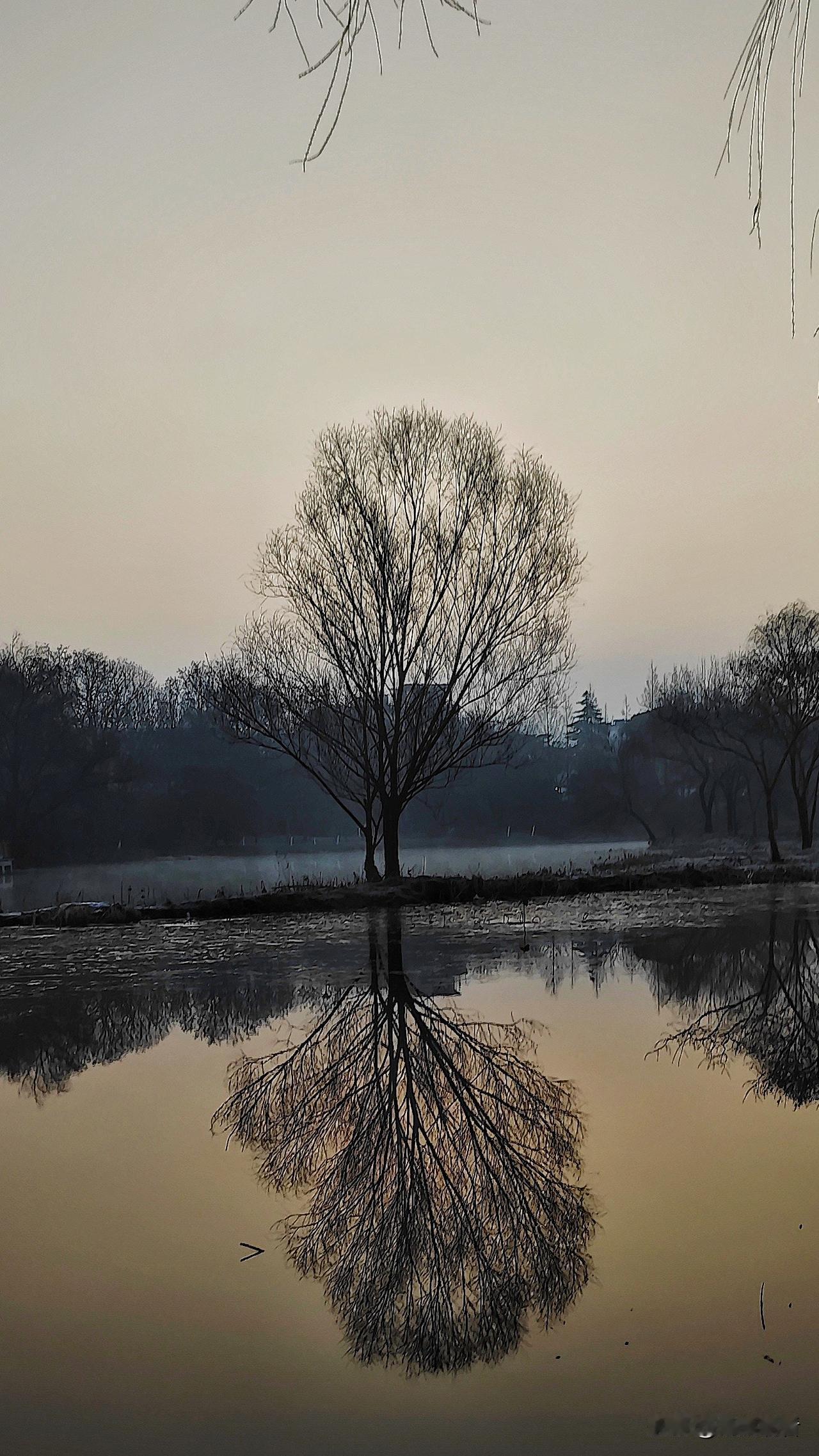 天旷地寒,树影婆娑映水中。水如镜,照见饱经沧桑的“老己”,那是沉淀过往、相对静止的自我;水亦流动,暗合不停歇的时光。静与动、过往与当下在此交织,是对自我与时光关系的深刻思索,藏着在静动态中徘徊的感悟。