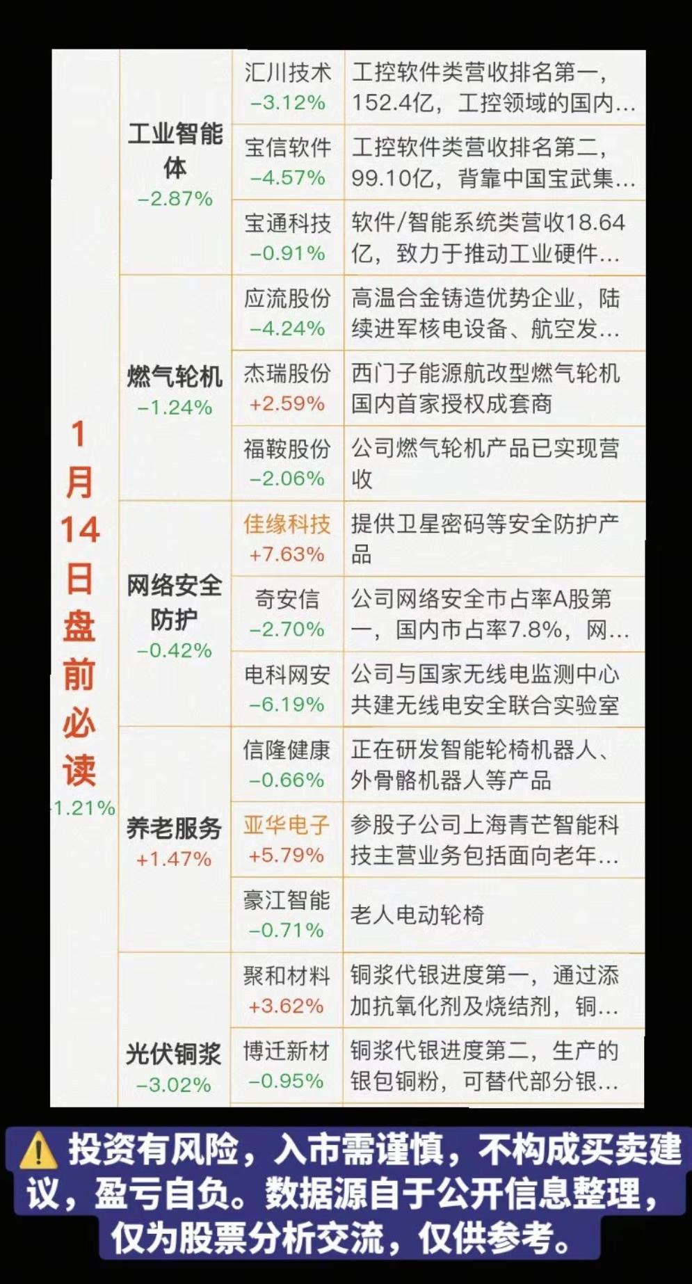 1.14周三 盘前 财经热点必读! 1.工控软件,工业智能体 2.网络安全 3.养老产业 4.燃气轮机,电网设备 5.光伏铜浆