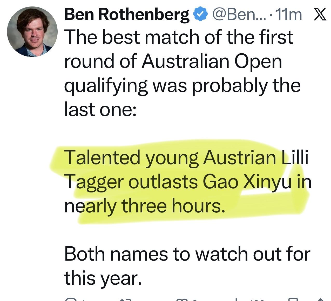 2026 锦织圭因伤退了澳网资格赛 著名网球评论员说高馨予🆚 tagger 🇦🇹的资格赛是第一轮最精彩的比赛,2人都会是未来之星。小高输了,有点遗憾。