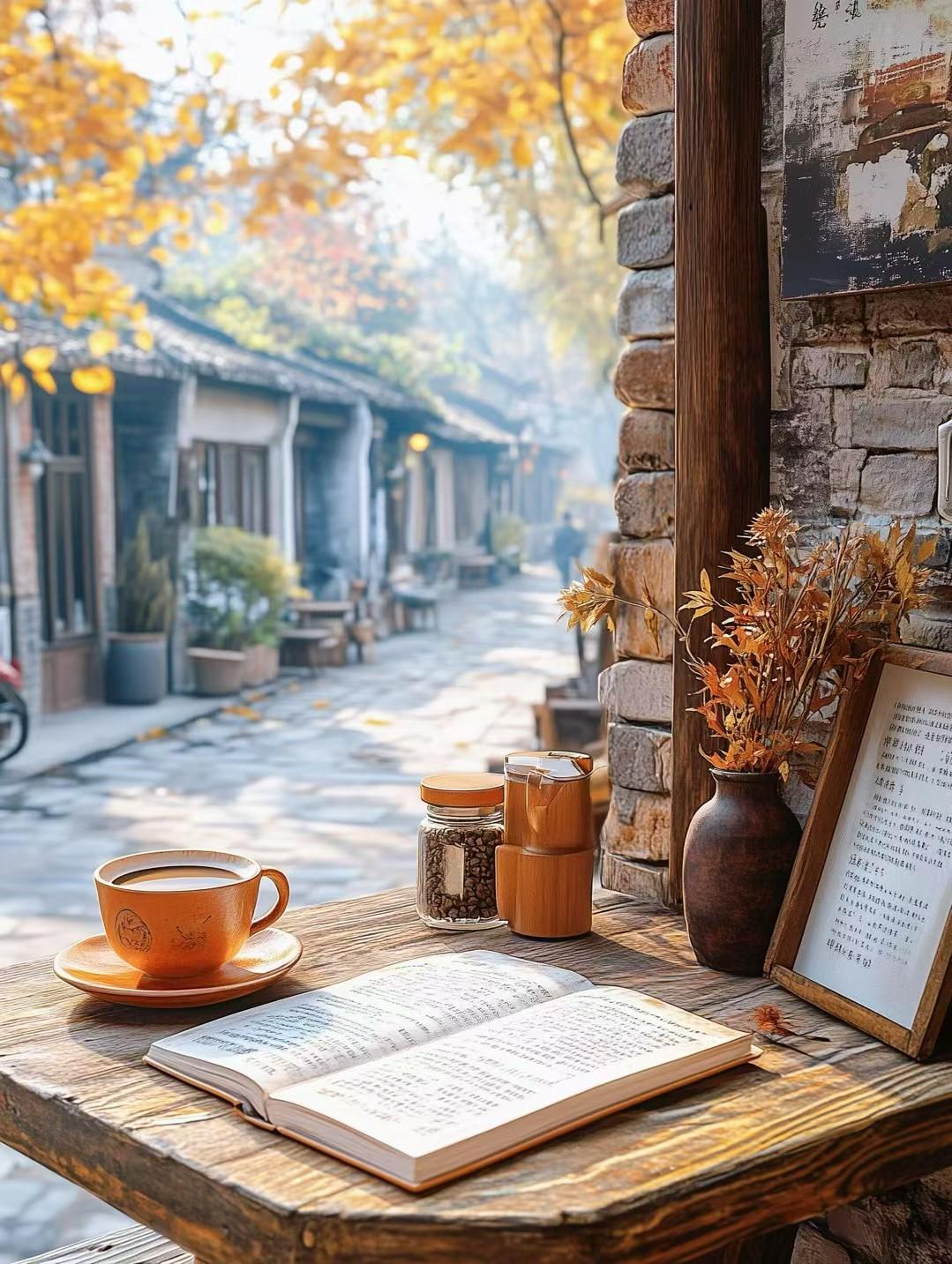 秋日暖阳下,静享一杯咖啡,翻阅一本好书。