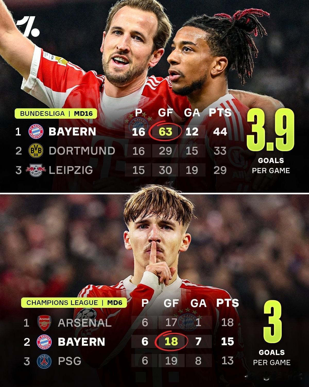 拜仁慕尼黑的进攻火力确实被广泛讨论,但似乎仍未被足够重视😭🤯 他们在德甲赛场场均攻入近4球,持续用行云流水的进攻席卷每一条战线,堪称欧洲足坛现阶段最具统治力的球队之一👨🍳🔥 目前欧洲最顶尖的战力中,他们绝对占据一席之地(甚至堪称最强)😮💨。 他们锋线是目前欧洲最强三叉戟吗? 🇫🇷奥利塞9⚽️9🅰️ 🏴凯恩20⚽️4🅰️ 🇨🇴迪亚斯9⚽️8🅰️