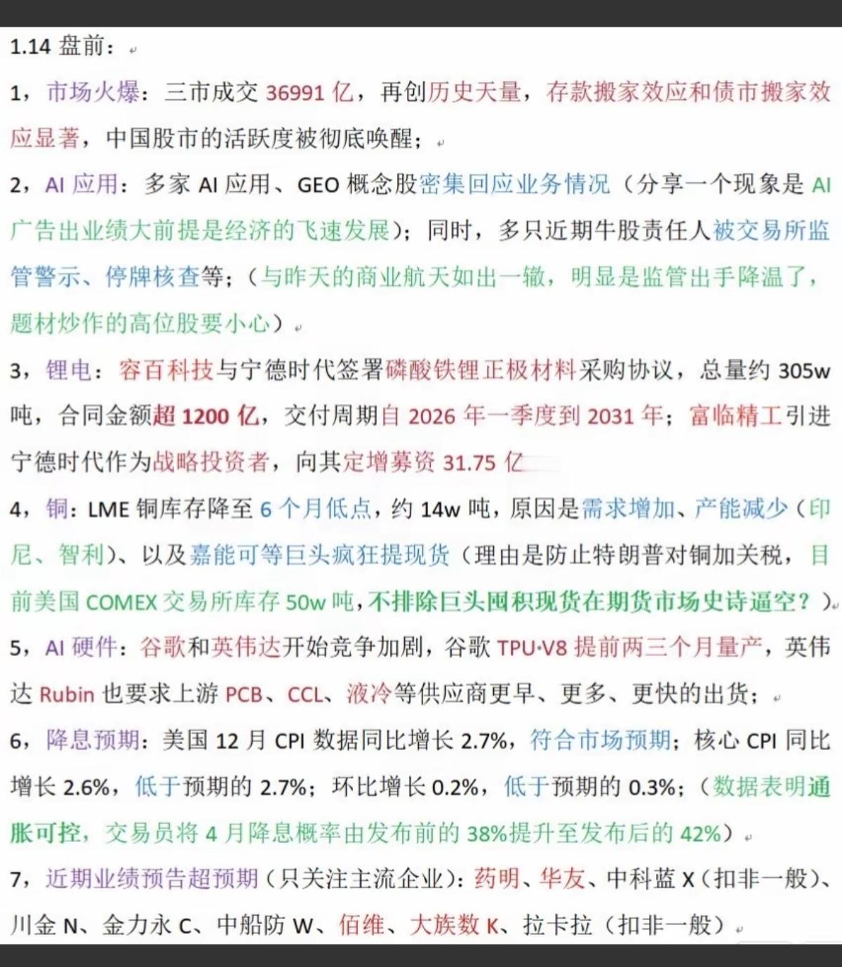 1.14周三 最新:财经热点新闻! 1.多家AI应用,GEO概念, AI硬件 2.铜库存降低至6个月低点 3.北美缺电 4.存储芯片 5.创新药