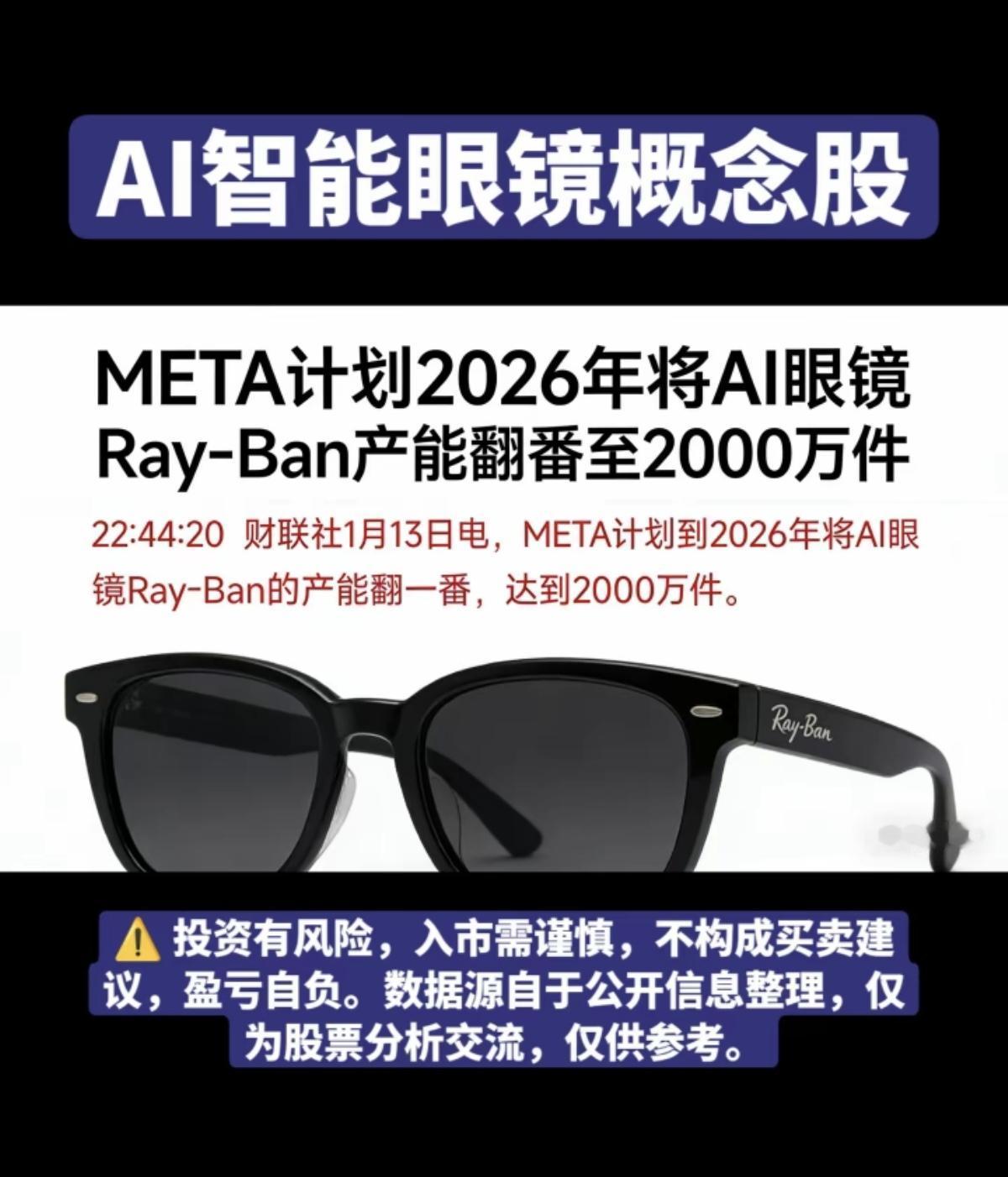 AI眼镜 概念股! META计划2026年将AI眼镜Ray-Ban产能翻番至2000万件! AI眼镜迎来爆发式增长! 相关核心龙头受益股: