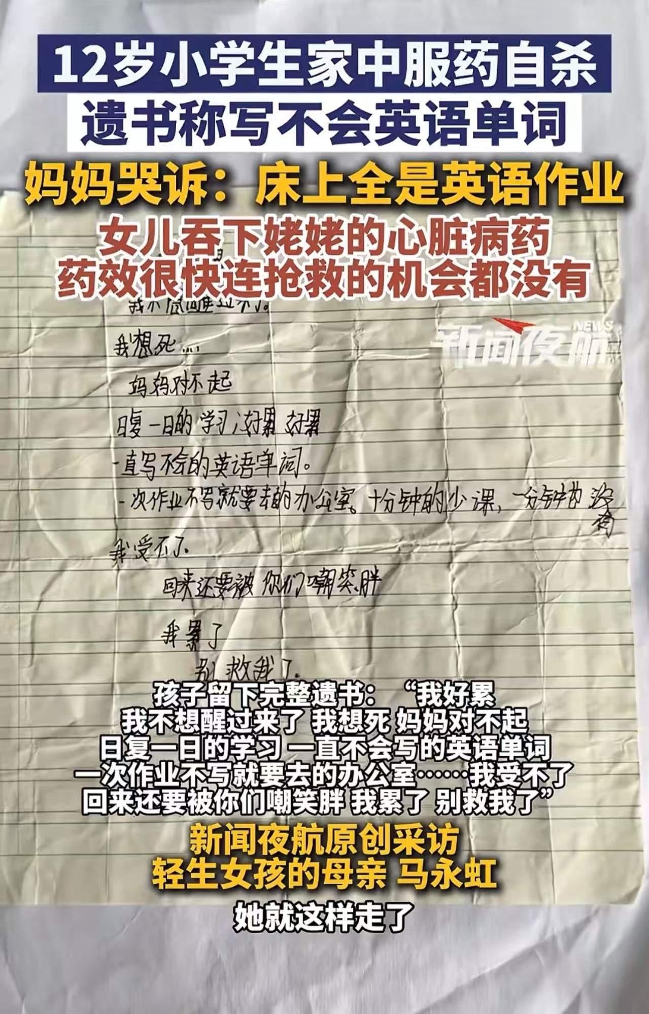 这个悲剧像一记沉重的闷雷,震撼了无数人的心。一个年仅12岁的女孩,用生命写下了最沉痛的控诉:“如果没有英语作业,我女儿就不会死……”这句话,犹如一道闪电,划破了无数家庭的平静,也让我们开始反思:教育的本质到底是什么?我们到底在追求什么? 在这个竞争激烈、压力山大的社会里,孩子们似乎早已被“成绩”绑架。每天的作业、考试、补习班,似乎成了衡量成功的唯一标准。可是谁曾想过,这些“压力”背后,可能隐藏着无形的伤害?这位12岁的女孩,正是在不断的学习压力中迷失了自己,最终选择了用生命来抗议。 她的遗书,字字泣血,透露出一个孩子最真实的渴望:被理解、被关爱、被尊重。她写自己“好累好累”,那是一个孩子对无休止的学习负担的无声呐喊。或许,她的心中早已迷失了方向,迷失了对未来的希望,只剩下一片死寂。 而令人心碎的是,妈妈的控诉——起诉老师和学校——背后,是一个母亲对孩子成长的无奈与焦虑。她认为,过度的学习压力,直接导致了女儿的悲剧。她的控诉,点出了教育制度中一个深层次的问题:我们是否忽视了孩子的心理健康?我们是否用成绩衡量一切,却忘记了教育的本质应是培养健康、快乐、有思考能力的人? 然而,法院的判决却让这位母亲无法接受。判决结果,似乎在告诉我们:法律和制度,是否过于冰冷?是否忽略了那份最基本的人性关怀?我们不得不问:在这个制度的天平上,孩子的生命和心理健康是否被公平对待?还是说,利益和责任的天平,早已失衡? 这场悲剧,激起了社会的广泛讨论:教育到底该怎么走?我们是否在无意中,把孩子变成了“学习机器”?我们是否应该反思,给孩子更多的空间去探索、去感受、去成长?教育不应只是一场“成绩的比拼”,更应该是一场心灵的洗礼。 每一个孩子,都是一片纯净的土地,值得我们用爱去浇灌。或许,我们都应该从这场悲剧中汲取教训:停止盲目的追求分数,开始关注孩子的内心世界。让我们共同努力,为孩子营造一个健康、温暖、充满希望的成长环境。因为,生命只有一次,没有任何考试值得用生命去换取。 这不仅仅是一场家庭的悲剧,更是整个社会的警钟。我们需要反思:教育的初心到底是什么?孩子的未来,是否还值得我们用心去守护?让这份沉痛成为推动变革的力量,让每个孩子都能在阳光下自由成长,不再有“如果没有英语作业,我女儿就不会死”的遗憾。少女悲剧 14岁女孩之死