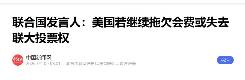 一夜之间,态度大变! 一向处事圆滑的联合国秘书长古特雷斯,就在1月8日的记者会上表示:如果美国继续拖欠会费,未来可能会失去在联合国大会的投票权。这可不是什么口头威胁,而是联合国搬出了压箱底的宪法级规则——《联合国宪章》第十九条。 以往美国拖欠联合国会费,向来算得精。欠款数额总能精准卡在失去投票权的门槛外,既达到施压目的,又不耽误自己行使权力。 但这一平衡在2026年1月7日彻底被打破。特朗普政府不仅拒绝缴纳当年的常规预算,更让累计欠款突破30亿美元,占全球总欠费额的七成以上。 这笔巨额欠款,还和一份大规模退群备忘录同步抛出。备忘录清单上列着66个国际组织,上到政府间气候变化专门委员会,下到世界卫生组织,几乎全被纳入其中。 白宫的意图再明确不过,要从根本上拆解现有的多边体系。他们给出的理由是,这些国际组织“管理混乱”,还在“推行全球主义议程”。 美方甚至直言,省下的这笔钱,要投到国际原子能机构这类“符合美国利益”的国际组织中。 这种把国际义务当交易的逻辑,再对照美国计划中高达1.5万亿美元的国防预算,格外刺眼。本质上,他们就是想逼着整个世界,都按美国的利益重新站队。 显然,联合国启动《联合国宪章》第十九条,是真的被逼到了绝境。秘书长发言人迪雅里克说得很直白,这是宪章里的硬性规定,是自动触发的法律机制,没有任何商量的余地。 他特别强调,联合国会员国的义务,没有挑选的余地。 联合国做出这个决绝表态时,自身已经濒临破产。组织年度预算被砍掉15%,近两千名员工因此失业。 在非洲之角,人道主义援助的资金链直接断裂;而在日内瓦总部,水电供应都开始受限。 要是对这个最大的欠费国网开一面,联合国自身的规则就成了一纸空文,它的合法性和运作能力会同时崩塌。 权力和责任从来都是对等的。美国承担着联合国22%的常规预算,没道理只想要权力,却不履行义务。 值得注意的是,美国的盟友体系也开始出现松动。从突袭委内瑞拉,到威胁格陵兰岛,美国一系列单边行为,早就让盟友们感到不安。 这种把外交当交易的做法,正逼着欧盟、日本等传统盟友加速寻求“战略自主”,美国的联盟根基,正在被慢慢动摇。 更关键的是,国际体系本身展现出了很强的韧性。比如美国退出世界卫生组织后,其他国家很快补上了资金缺口,还摸索出了没有美国参与的运作模式。 美国的缺席确实带来了冲击,但并没有让世卫组织陷入瘫痪。 《联合国宪章》第十九条的启动,其实说明了一个残酷的现实,二战后建立的、以规则为基础的国际秩序,正在和只讲即时利益的单边主义发生碰撞。 美国想靠退群和断供绑架整个世界,或许到最后会发现,被国际规则抛弃的,恰恰是它自己。 信息来源:《联合国发言人:美国若继续拖欠会费或失去联大投票权》,中国新闻网,2026年1月9日。