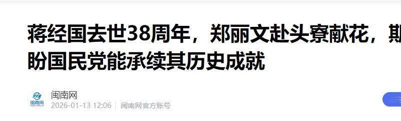 就在刚刚, 台"国民党"主席郑丽文正式宣布。 1月13日一早,郑丽文站在镜头前,表情坚定,语气缓慢却不含糊:“我郑重宣布,作为国民党主席,我将前往中正纪念堂谒陵,向蒋经国先生致敬。” 1月13日,蒋经国逝世38周年。郑丽文领着一帮党务主管前来祭拜,她要给这个路线摇摆、认同混乱的国民党,来一次彻底的清理。 国民党的病根,其实早就种下了。在强大的“本土”话语面前,党内不少头面人物连话都不敢大声说,做事更是处处受限。 被寄予厚望的蒋家后人蒋万安,之前在上海双城论坛上几乎没什么声音,那句轻轻的“我是台湾人”,在郑丽文这样的人看来,根本不是什么接地气。这种退让,正在掏空国民党的根基。 当天上午,郑丽文直接把话挑明了。她就在中正纪念堂,当着所有媒体的面,几乎是点名给蒋万安“上课”。 她讲得很白,是民进党硬要把“台湾人”和“中国人”搞成对立。可在我们这里,台湾人的身份认同,跟背后的中华文化、民族根源,从来就不是二选一的选择题,而是一体的。 这话当然不只是说给蒋万安一个人听。卢秀燕、江启臣这些党内诸侯,个个心里都有数。 郑丽文等于是在公开喊话,国民党的核心论述都快讲不出口了,我今天来帮你们补上这一课。 潜台词很清楚,如果连这点坚持和勇气都没有,那每年跑来这里拜蒋经国,不就是走个过场、演给谁看? 回想当年,蒋经国顶着巨大的内部压力开放两岸探亲,他靠的就是一个最简单不过的想法,让老百姓回家团圆。 就是这份魄力,打破了几十年的僵局。再看看今天国民党的一些人,在“九二共识”这些核心问题上说起话来含含糊糊,实在是天差地别。 路线要改,首先就要动人。国民党文传会最近的人事变动,就是这场斗争的第一个结果。 吴宗宪一直被看作是侯友宜的人,他从文传会主委的位置上下来,不管官方说法是什么,都意味着控制权换人了。 接替他的是尹乃菁,这个任命背后就是郑丽文的意志。这等于直接宣布,国民党高层受够了那种“蓝皮绿骨”的摇摆不定。 过去几年,从侯友宜、卢秀燕到柯志恩,党内一些大咖面对民进党,特别是赖清德时,总是摆出一副和和气气的姿态。 但在强硬派眼里,这就是没有信念,没有斗志,是怕对手太久,自己都快变成对手的样子了。 这种软弱让国民党的论述没有一点力量,支持者看得一头雾水,心里也越来越失望。 所以,权力核心必须重新洗牌。郑丽文派萧旭岑去大陆,着手筹备国共论坛,这些动作就是绕开党内那些瞻前顾后的山头,她要自己动手,打通一条真正能走的两岸和平之路。 当然,和平是实实在在的经济账。台湾对大陆和香港的出口,占了总额四成还多。这背后是几万家公司、上百万个家庭的生计。 最新的民调也显示,超过六成的民众希望两岸恢复正常来往,早就受够了没完没了的政治对抗。 在这些事实面前,那些只敢喊一句“我是台湾人”,却绝口不提“九二共识”的政治人物,显得既无力又失职。 这不光是看不清局势,更是在拿民众的饭碗开玩笑。联合国的2758号决议、全球产业链对台海稳定的要求,这些都是躲不开的现实。 郑丽文强调要“为和平打开一扇门”,正是说出了岛内许多人想说又不敢说的心里话。 国民党急着整顿内部,还有一个原因,就是那个曾被寄予厚望的“蓝白合”,越来越指望不上了。 柯文哲和民众党的态度变来变去,让在野联盟脆弱不堪。甚至有消息说,跟绿营眉来眼去的陈昭姿,可能在黄珊珊等人的力挺下,成为民众党的党团总召。 这几乎是给“绿白合”打开了一扇门,蓝白之间的合作随时可能泡汤。 柯文哲的个人性格和对权力的渴望,已经拖累了整个在野阵营。如果不能建立一个统一、坚定的核心理念,在野力量只会在内耗中不断被消耗。 郑丽文在这个时候出手整顿,就是向所有人发信号,国民党不想再被人牵着鼻子走了,也不想再把希望寄托在没有原则的利益交换上。 三十多年前,蒋经国为民众团圆破冰。今天,郑丽文这一系列强硬的动作,到底能不能逼着国民党重新找回那份遗失已久的胆识?这才是这场风暴背后,最根本的问题。 信息来源:《蒋经国去世38周年,郑丽文赴头寮献花,期盼国民党能承续其历史成就》,闽南网,2026年1月13日。