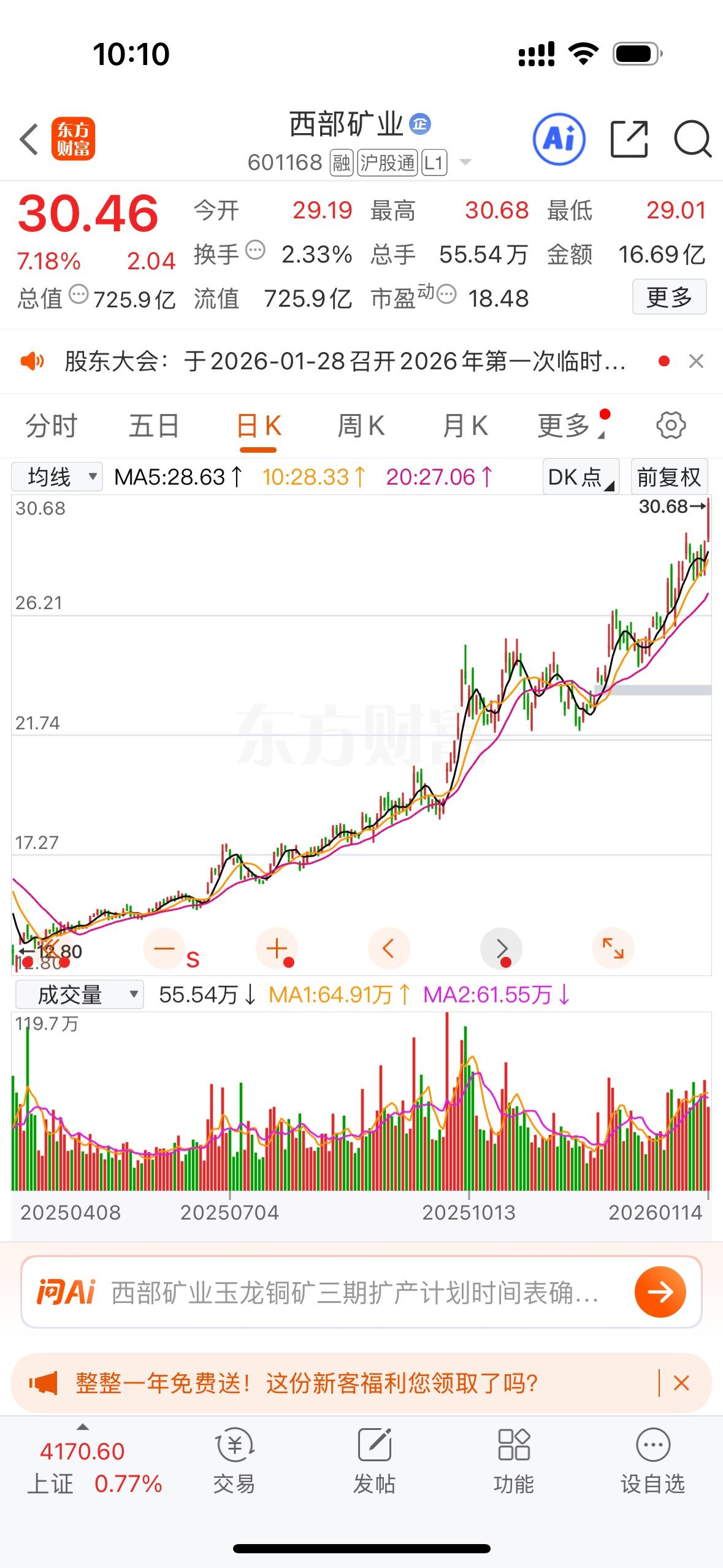 西部矿业股价为何一路飙涨? 周期龙头西部矿业股价狂飙,核心是铜价、资源、产能三大利好共振。 沪铜主力合约涨幅超20%,全球供需缺口推升铜价看涨预期;玉龙铜矿新增铜金属131.42万吨,累计储量达753.39万吨,资产价值重估;三期扩产与茶亭铜矿落地,打开长期成长空间。 新能源需求加持,战略矿产政策护航,长线资金抢筹,估值从周期向成长切换。铜业务高占比、低成本优势凸显,盈利弹性持续释放,成A股周期赛道最强黑马! 铜价破位、扩产延迟、安全事故、估值回归,四风险需警惕。