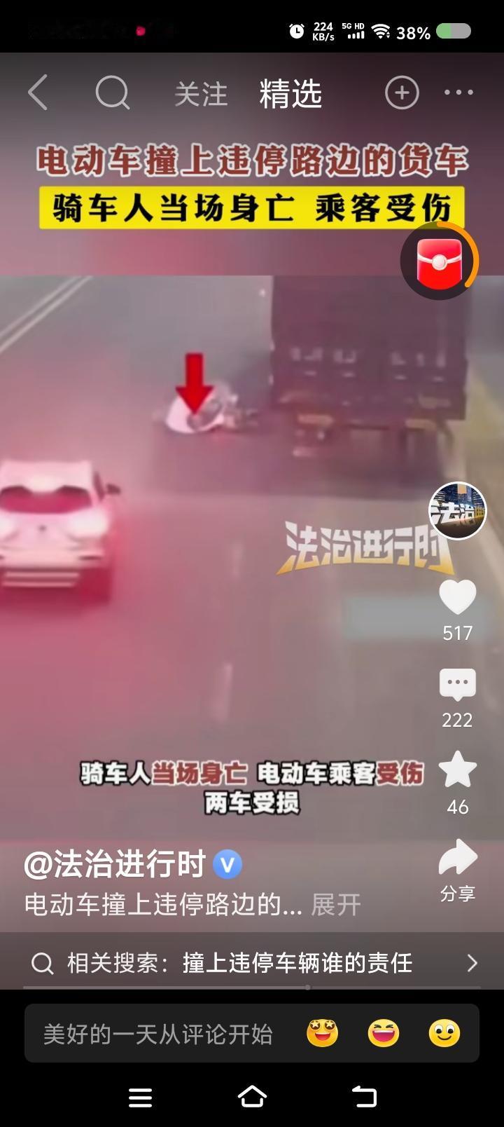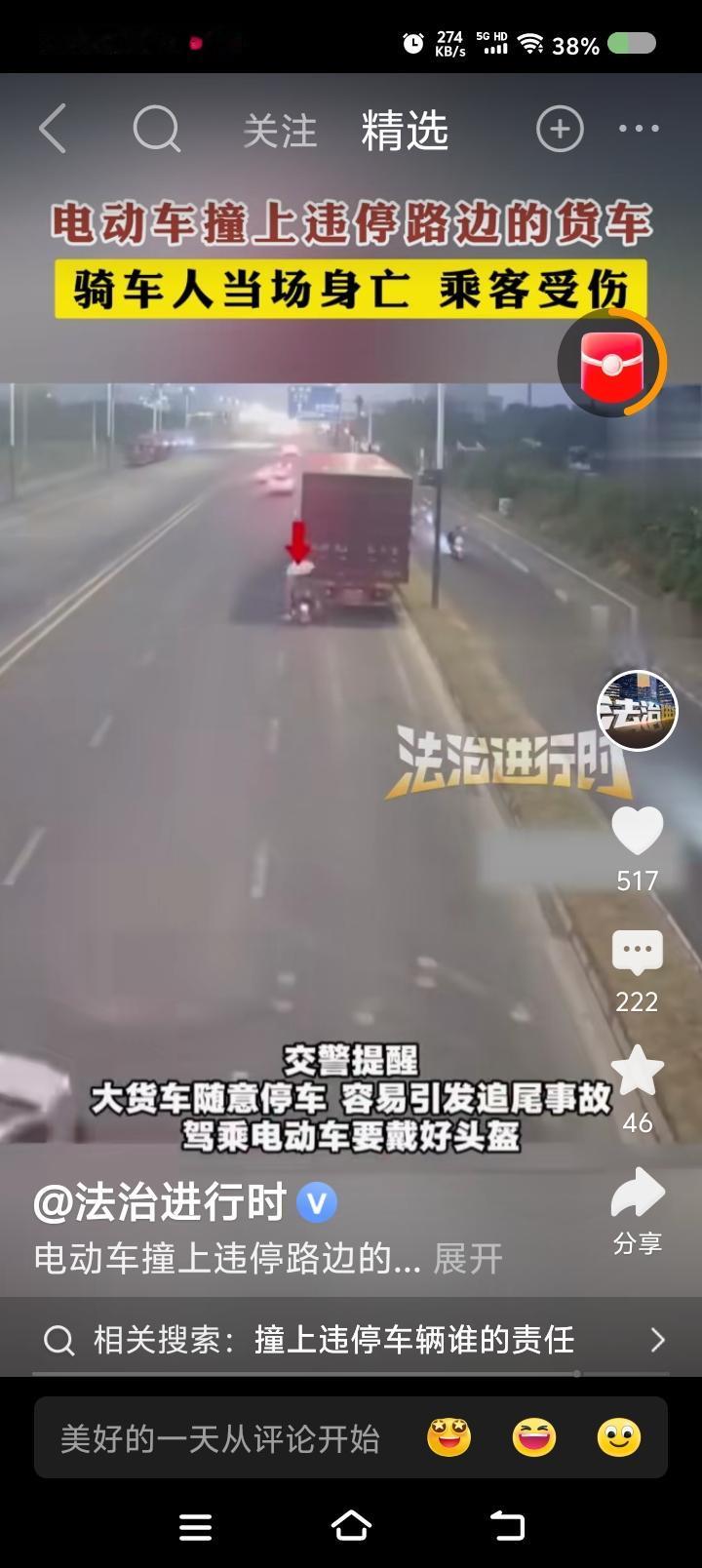 谁的责任?—— 据报道,一货车违规停车,一辆载人电动车撞上了。骑车人死亡,乘客受伤。 点评: 有人怀疑骑车人看手机了。从视频看,骑车人一直前行,到货车跟前了才转弯,来不及了。 不管责任怎么划分,交通安全第一,生命只有一次。 我无数次看到车辆乱停,主路上也有。小区里,晚上,有的车停在大路一侧,那里根本不是停车位。有人骑车,很可能撞上。因为路灯不怎么亮。