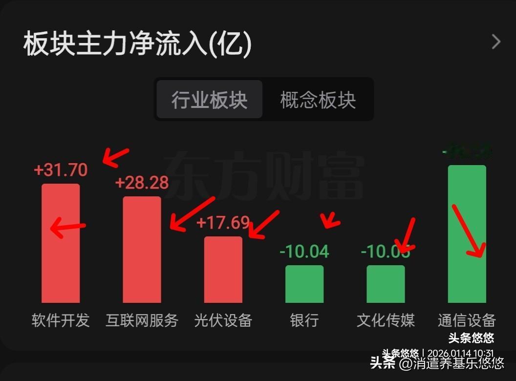14日午间看盘,昨天后退一小步,今天前进一大步,大盘有可能反包昨天阴线,三大股指高开高走,做多热情不减,热点有扩散现象。 板块涨幅居前的有 金融科技,ai,可控核聚变,光伏,传媒游戏,人工智能,云计算,存储芯片科创芯片,半导体,脑机接口,固态电池等。银行煤炭红利板块小幅下跌! 主力资金流入比较大的板块有 软件开发,互联网服务,光伏设备,证券,互联网金融,大数据人工智能等。 主力资金流出较多的板块有 商业航天,通信设备与cpo,低空经济,文化传媒,银行风电设备等。 截止时间10点30分,两市成交额1.58万亿元,比昨天萎缩2400亿元,主力资金流入32亿元。目前是缩量反弹! 点赞转发关注投资理财不迷路。