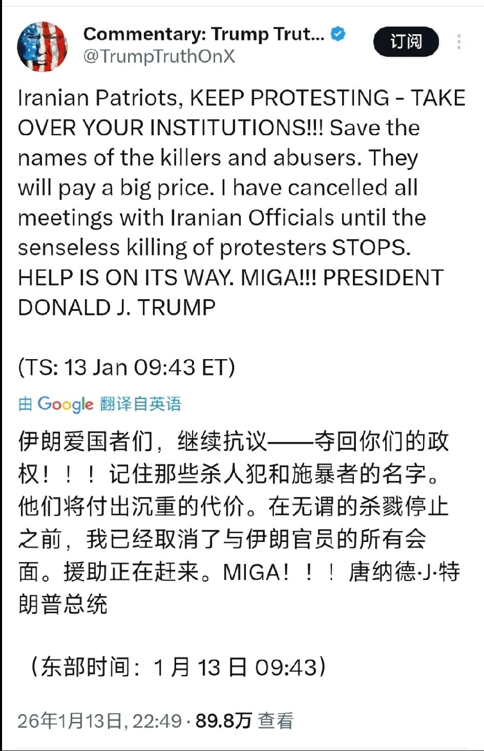 美欧与海湾诸国 请看报道,北京时间1月13日晚,特朗普发文:“伊朗爱国者们