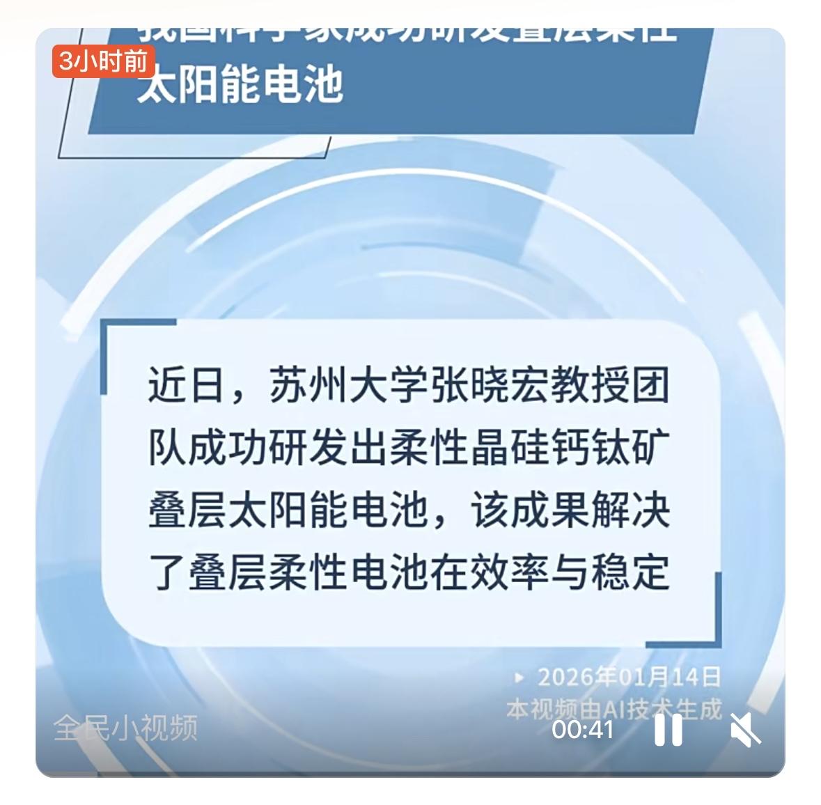 苏州大学张晓宏教授团队研发出柔性晶硅钙钛矿叠层太阳能电池,通过双材料叠加拓宽光吸收波段,大幅提升转化效率,相关成果发表于《自然》。该技术凭借双层缓冲层结构、氢掺杂薄膜界面优化两大核心设计,破解柔性电池效率与稳定性难题;经模拟太空环境测试,电池耐冷热循环、抗辐照性能优异,可满足航天器及太空数据中心的长期供电需求。