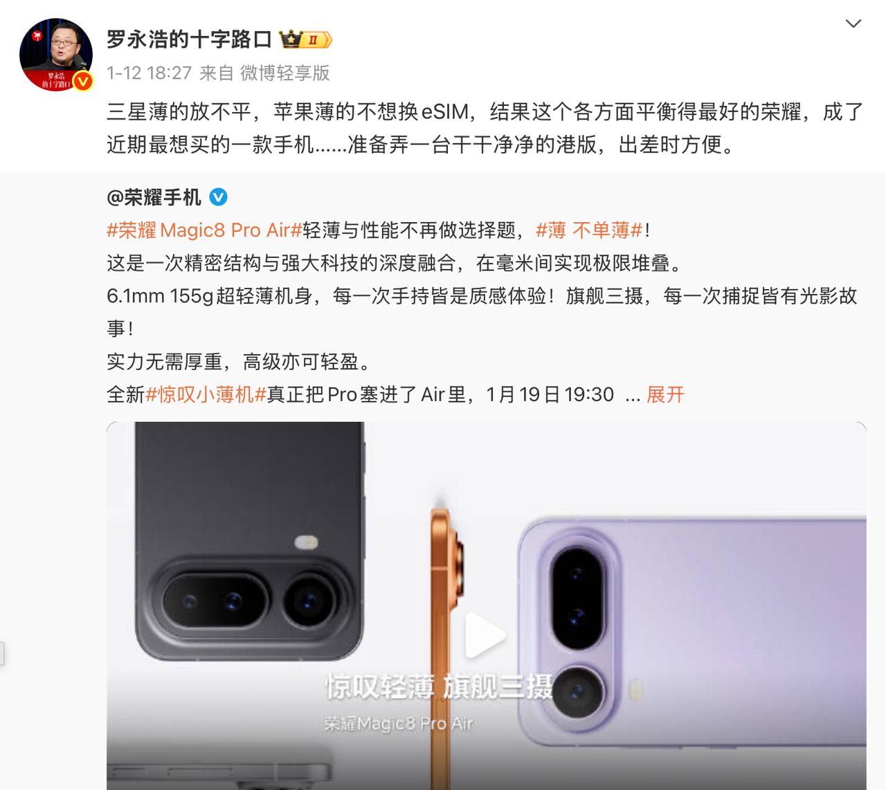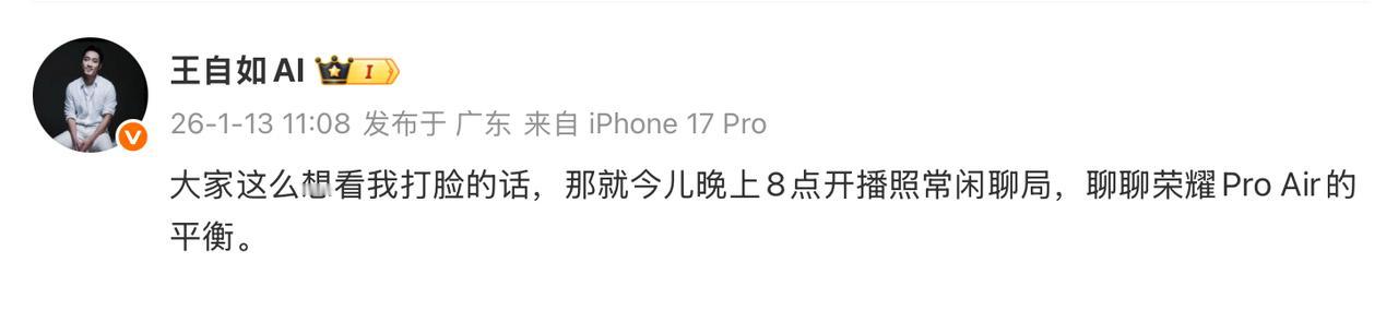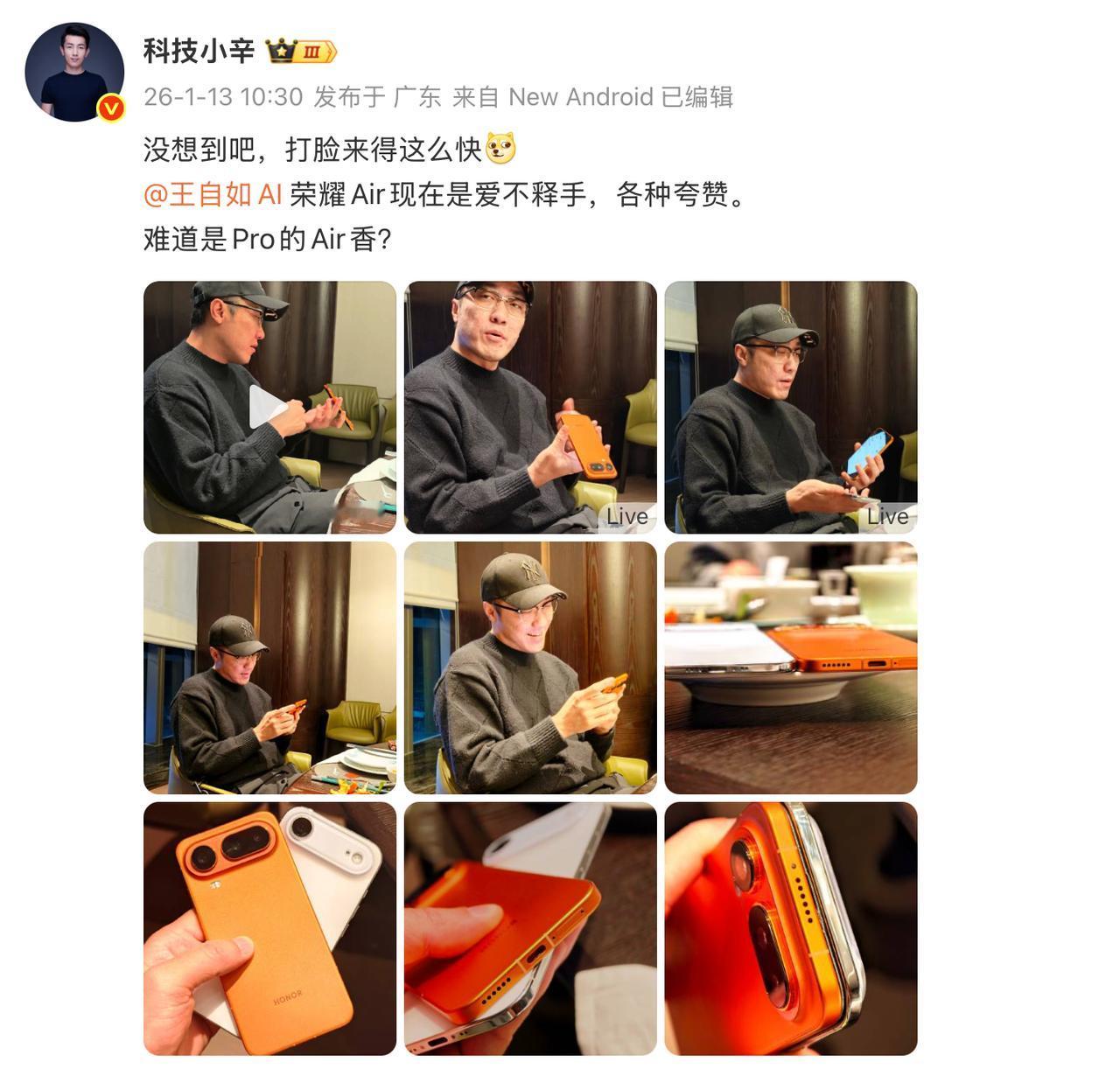 前些天王自如说到的安卓做不好Air,昨晚直播看荣耀Magic8 Pro Air能否打脸。 这波打脸来得很快,安卓阵营的Air,是真的能做好。看辛总发的,王自如拿着荣耀的Air露出了满意的笑容啊。 话说,在安卓Air这块,老王和老罗这波是,观点一致了