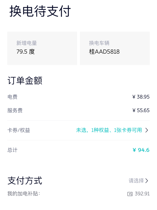 网友吐槽蔚来换电费用高是真的吗 最近发现有人吐槽换电和充电费用相差很大,我觉得用上换电省钱小妙招后,换电的费用和充电是差不多,非要说区别:一个3分钟满电出发,另一个30-40分钟满电出发。 我的用车城市是广西省南宁市,电价挺贵的0.8元/度(无峰谷电,个别站点例外)+上0.2元的服务费,所以充电价格基本上在1元/度以上,做为此次对比对象蔚来石门公园换电价格为1.19元/度,充电价格为0.99元/度。 刚好换了一次电新增79.5度,如果是充电的话79.5×0.99=78.705元。 省钱小妙招来了:蔚来换电券某海鲜市场售价75元左右(是不是比充电还便宜)。 充电电价和换电电价是一样的,区别在于收取的服务费,我记得蔚来也有免服务费抵扣券(市面上太少,就不过多介绍了)。 蔚来商场的换电服务费券包179元(一般蔚来App签到能拿到-20的券),所以最终159元左右能买下此套餐包,159元抵325元,拆分在35次换电中(有效期180天)一次订单能省几块钱。 所以说不怕麻烦就去买换电券来抵扣,想方便一点买个券包(对比充电一次费用差也就是十来块钱)。 最后问大家一个问题:换电多花十来块钱来买30-40分钟的充电等待过程,你觉得值得吗?