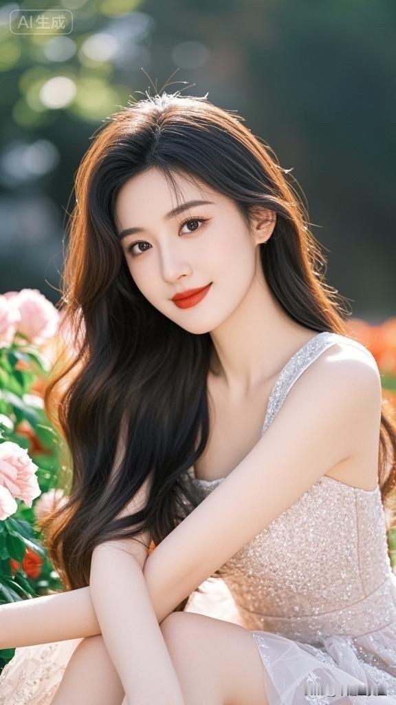 优雅红裙,玫瑰相伴,气质女神