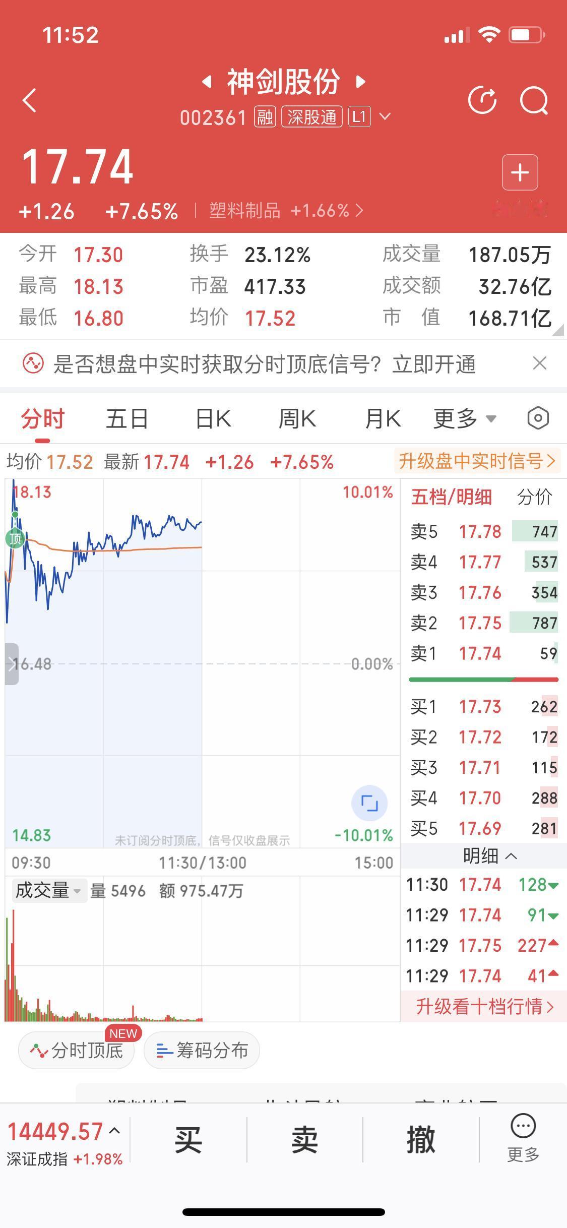 1月13日神剑股份早盘跌停,我在它从跌停拉升到最高点涨2.85%时进了场。今天是