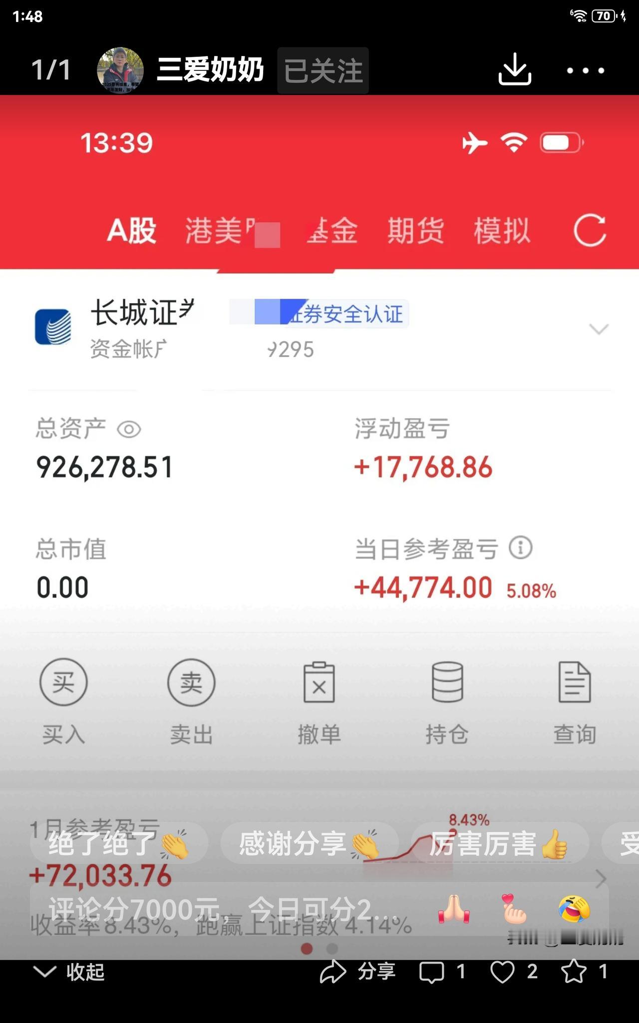 牛市的赚钱效率就是如此之高,奶奶昨天的资产还是8字开头,今天一下子就冲到9字开头了,实在太牛了!怪不得奶奶炒股胆子这么大,全仓闭眼买入,简直气死那些胆小的人。加油,向百万资产进军!