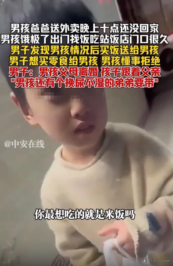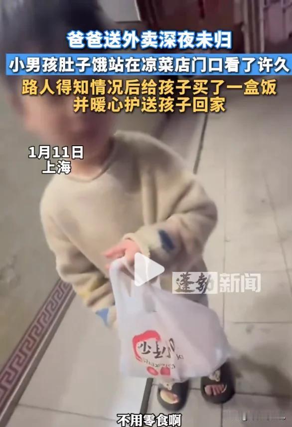 1月11日深夜10点,上海。 男子看到一个五、六岁的小男孩,穿着薄毛衣,脚穿凉鞋,站在饭馆门口,上前询问。原来男孩的父母离婚了,和弟弟跟爸爸生活,爸爸跑外卖,他饿了,出来找东西吃,男子给他买了盒饭送他回家。想买点零食,男孩说“不喜欢吃”。 都说,穷人的孩子早当家。男孩这么小,就知道“断绝欲望”。要知道零食对于孩子有致命的吸引力,有的孩子把零食当饭吃,这个男孩却说只爱吃饭,真是懂事得让人心疼。 孩子的妈妈哪去了?虽然离婚了,孩子总是你生的吧?男孩还要照顾一个穿纸尿裤的弟弟,你于心何忍? 不能怪爸爸,他已经尽了全力……