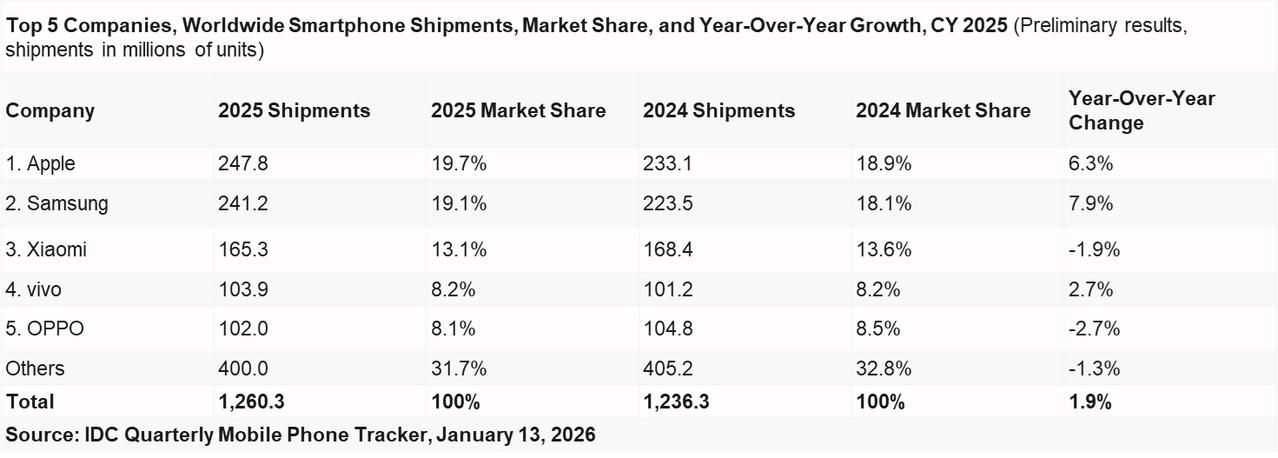 2025年全球智能手机出货12.603亿台,同比增长1.9% 1. 苹果:2.478亿台 2. 三星:2.412亿台 3. 小米:1.653亿台 4. vivo:1.039亿台 5. OPPO:1.020亿台 2025年中国智能手机出货2.846亿台,同比微降0.6% 1. 华为:4670万台 2. 苹果:4620万台 3. vivo:4610万台 4. 小米:4380万台 5. OPPO:4340万台 国内top5厂商出货量差距都不太大,