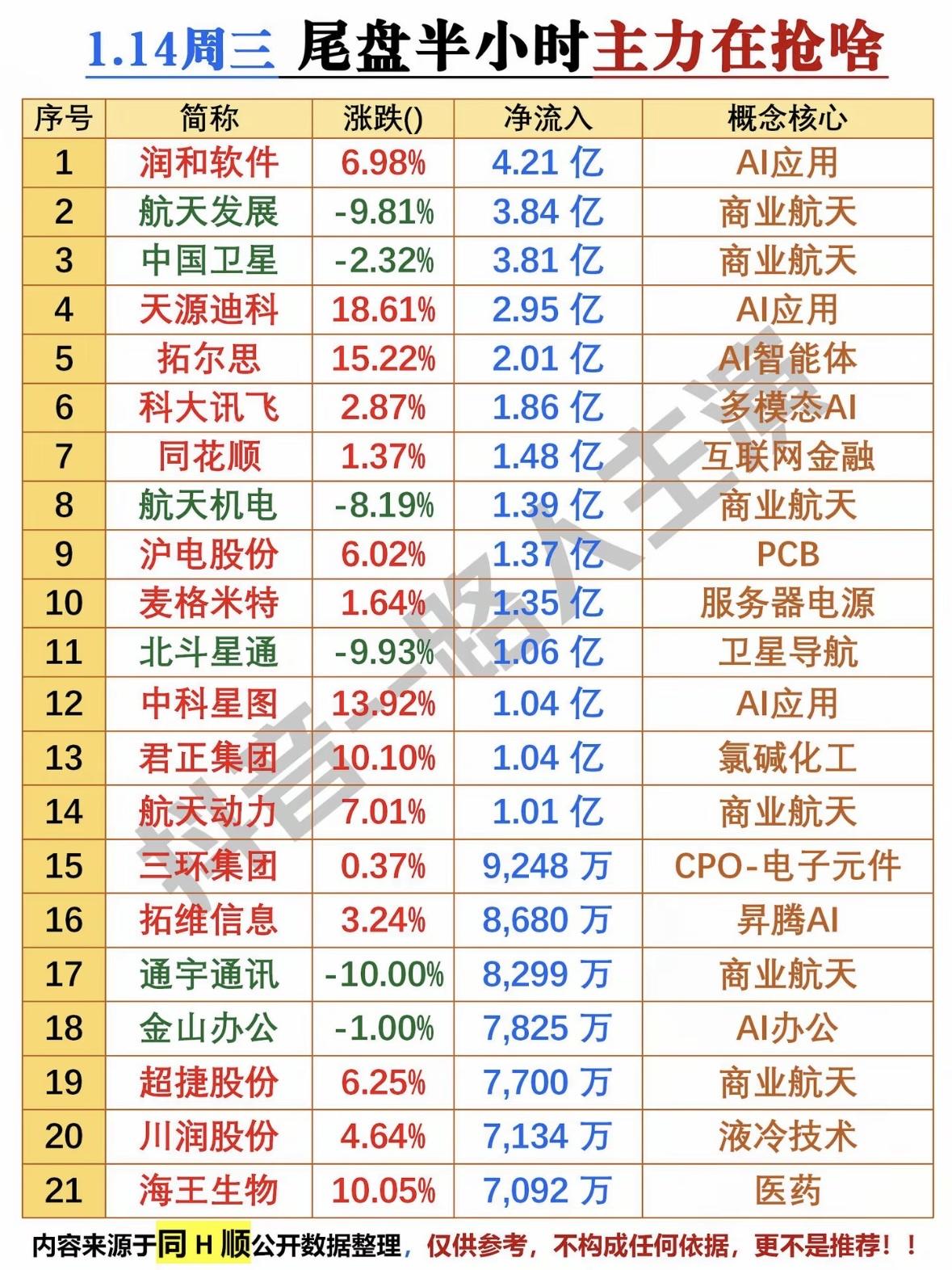 尾盘半小时主力抢筹股票排行,AI应用、商业航天等概念领涨! 主力抢筹AI与航天股,润和软件、天源迪科领涨,科技与军工板块受青睐。 AI概念股异动,润和软件领涨,航天板块分化,资金聚焦科技与商业