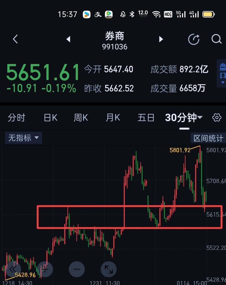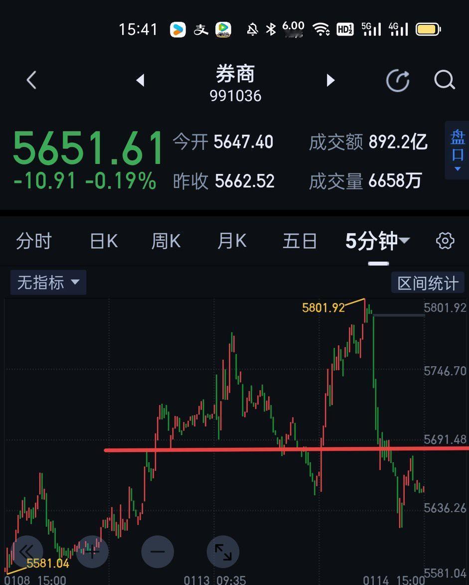 券商板块受中午一则"交易所提高融资保证金"公告的影响,上演了一幕过山车行情。5801是否成为券商日线一笔上的高点呢?明天还可以观察一天。券商尾盘形成五分钟一笔上的反弹,该笔反弹如果明天能站稳5680,券商后市仍可期待新高。如果该反弹止步于5680下方,可以适当降低仓位。券商5801开启的回落可生长成三十分钟的一笔下,后面就要看5570附近的支撑了。如果5570上方企稳,后市仍可谨慎乐观期待高点。如果5570下方企稳,后面暂当反弹看待,同时防止日线一笔下由此展开。