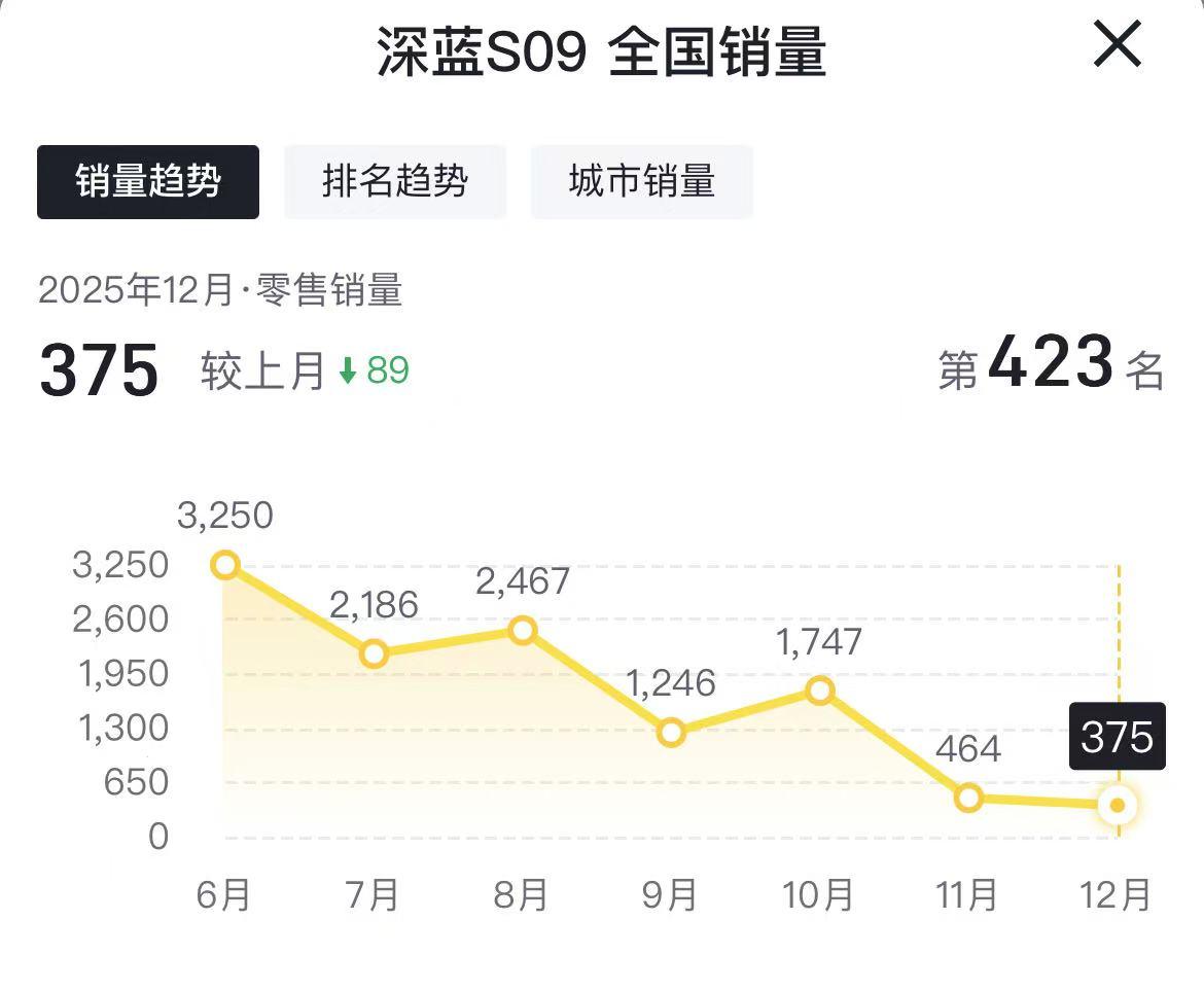 在新能源汽车市场大六座SUV蓬勃发展的时候,深蓝汽车旗下的深蓝S09销量却一路下滑,6月3250辆,7月2186辆,8月2467辆,9月1246辆,10月1747辆,11月跌倒464辆,12月份更惨仅有375辆了。 看到深蓝S09这样的表现,让我们想到了深蓝汽车旗下另一款方盒子SUV深蓝G318,12月份销量仅199辆,还真是难兄难弟呀! 那么为什么深蓝汽车会出现多款车销量低迷呢?【来自懂车帝车友圈】