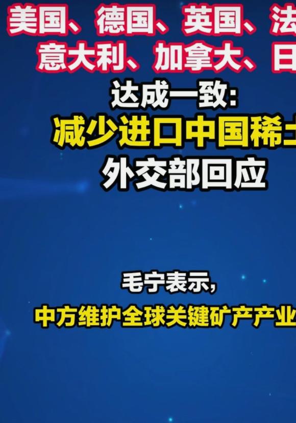 美国,日本,德国,英国,法国,意大利,加拿大七国抱团发声,声称减少进口中国稀土。 七国抱团说要少买中国稀土,看着挺唬人,其实他们根本离不开! 中国管控稀土,不是不让卖。是为了全球安全,只限制用在军事上。也是为了合理开采,给子孙后代留着。 大家都知道,中东有石油,我们有稀土。但很多人搞混了,他们要的不是稀土矿石,是能直接用的稀土产品。 世界上不缺稀土矿石,缺的是把矿石变成有用产品的本事。中国就是有这个本事,全球九成以上的稀土加工都靠我们。 他们的汽车、飞机、电子产品,都得用中国的稀土产品。美国自己挖的稀土矿石,还得运到中国来加工。日本更是几乎离不开中国的重稀土产品。 他们喊着减少进口,其实是想施压。可重建加工产业链,又要花钱又要技术,没个好几年根本成不了。 有网友说得对,国外没人真心希望我们好,只有祖国强大了,我们才能过得好。 中国的稀土优势就在这,他们想换供应源没那么容易。我们按自己的规矩来,合理管控,既保安全又为后代,这才是真靠谱!