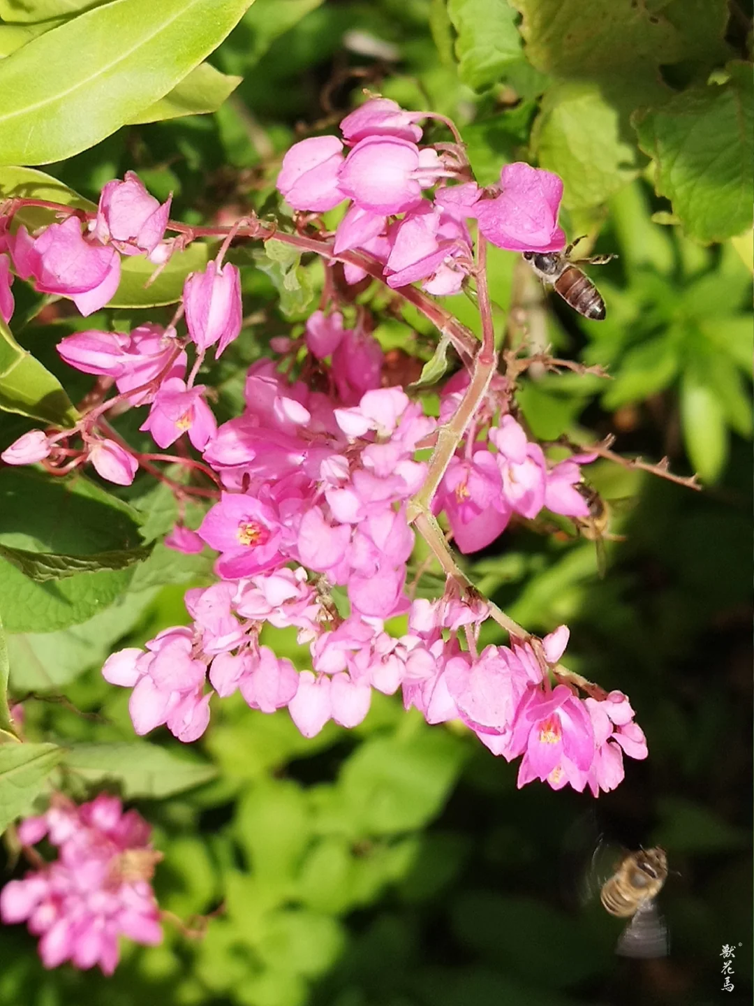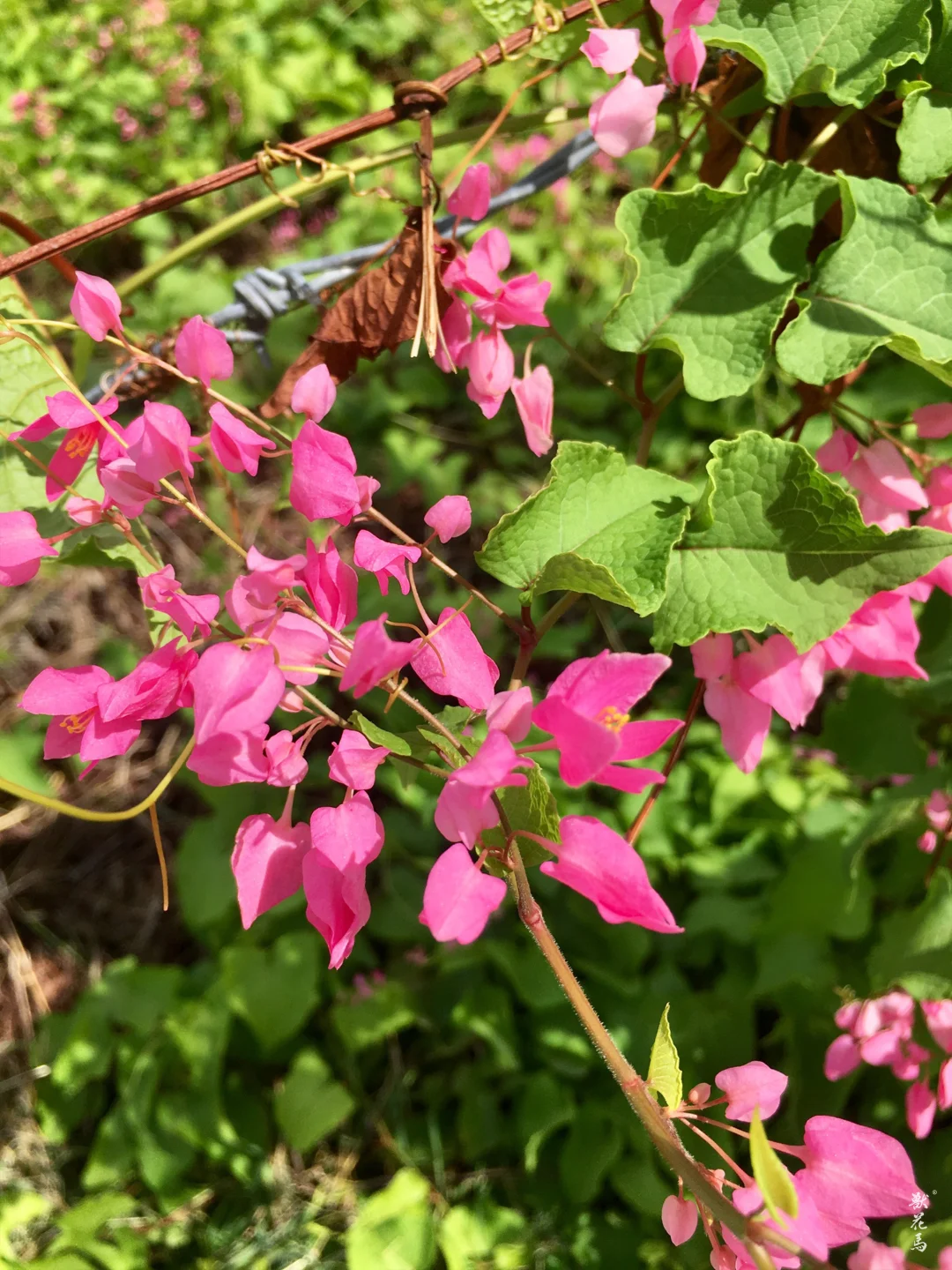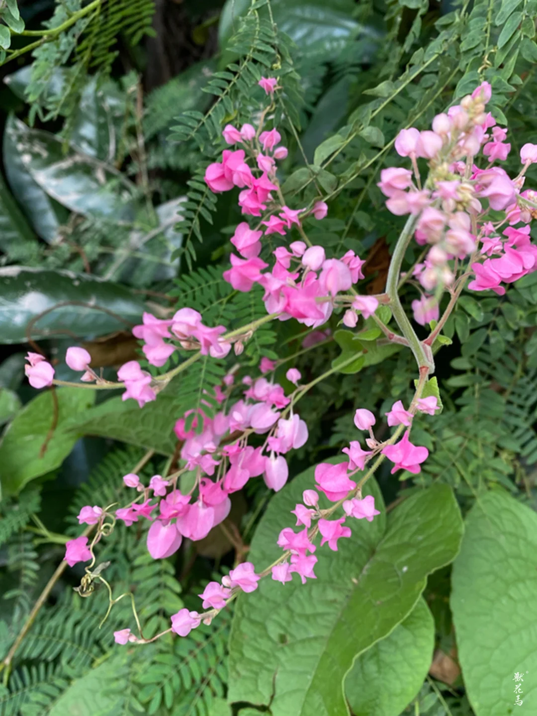 ✨心形叶片层叠交错,藤蔓攀援可达10米,花叶相映如粉色瀑布