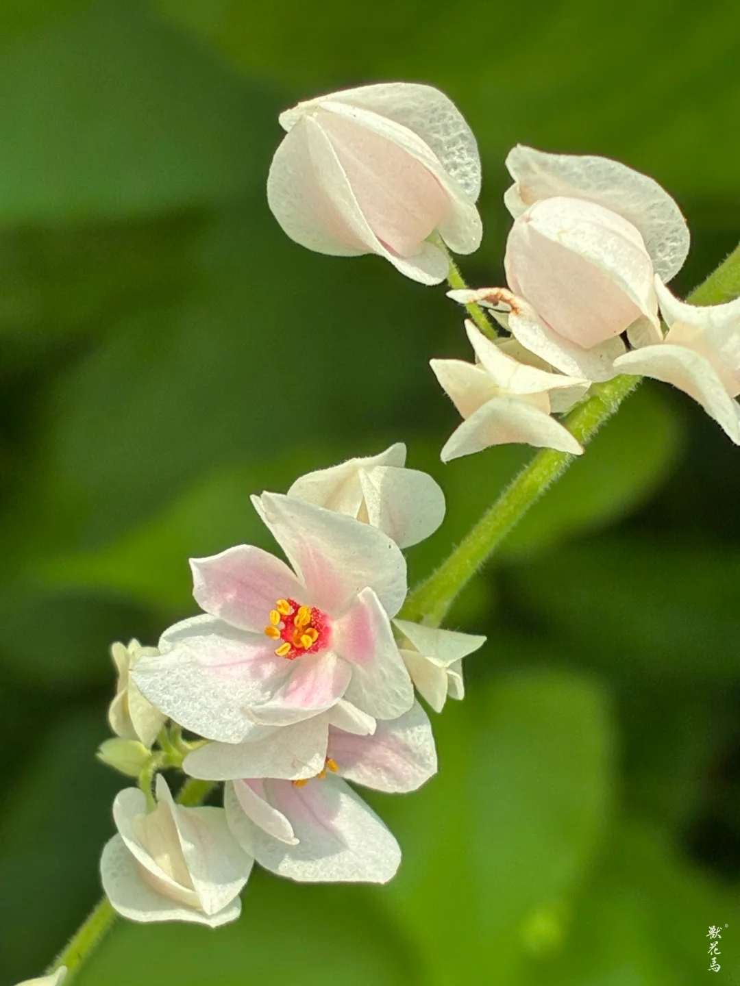 ✨总状花序如串串粉红项链,花瓣实为5枚萼片,中心缀黄蕊,轻盈浪漫