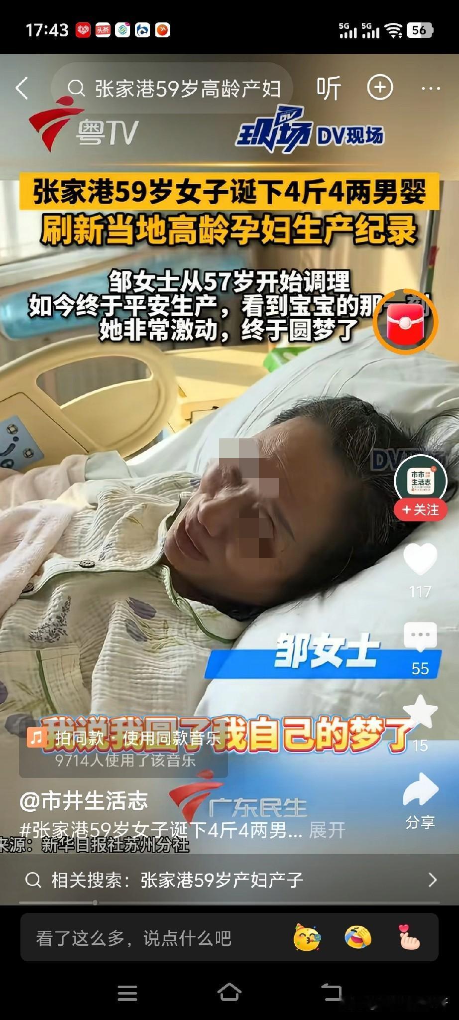 00后不结婚 90后不生娃 80、70后不生二胎 谁承想 多生孩子的任务竟然落到了退休老太太的头上了 60后竟然起到了模范带头作用 近日59岁高龄产妇诞下4斤4两男婴 该产妇称看到宝宝那一刻,她非常激动,终于圆梦了 真太佩服她的勇气了 她生二胎只因为一个原因:孤独。 因女儿在英国定居 她选择再生一个孩子。 只能到了当奶奶的年龄, 却当了妈妈 她太伟大了。 值得年轻女性学习。 当然提前条件是一定要有雄厚的经济基础。