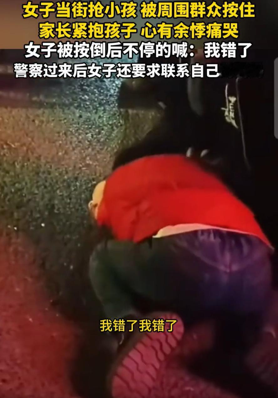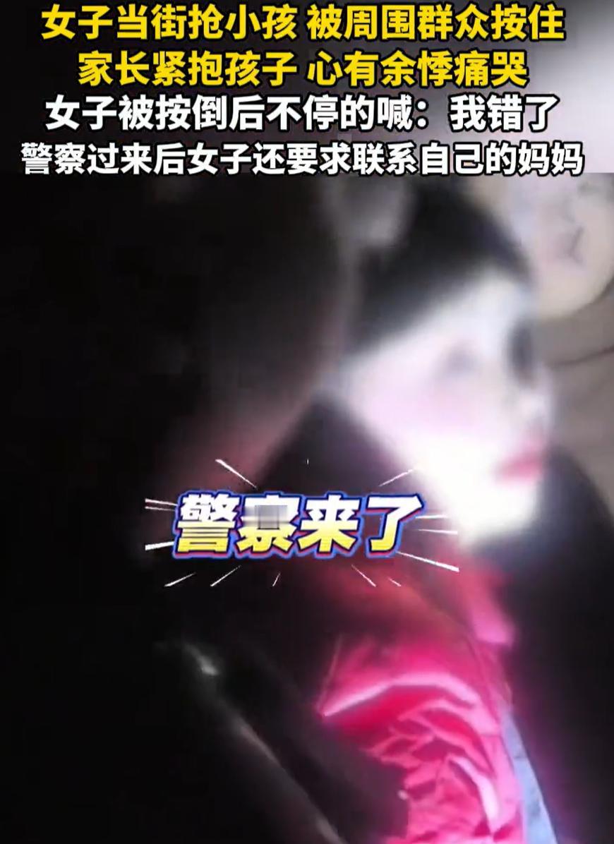 必须严惩!湖南邵阳,一位妈妈晚上带着孩子遛弯,没想到,一个不注意,一名中年女子突然冲出来抢走小孩,周围的路人听到动静后,当场将女子围住按在地上,女子求饶说以后再也不敢抱小孩了,可大家却没准备放过她 据悉,当时孩子妈妈正带着孩子悠闲遛弯,孩子就在身边,一个中年女子突然冲出来,目标很明确,直奔孩子,伸手就拽。不是试探,不是搭话,是实打实要把孩子从大人身边拉走 孩子的妈妈被这突如其来的袭击吓懵了,本能地紧紧抱住孩子,同时大声呼救:“抢孩子了!救命啊!” 那一声呼救,比什么都管用。周围的路人几乎是条件反射地围了上来,有人拉人,有人护孩子,几下就把女子按在地上。整个过程很短,但每一秒都很关键。其中一名男子更是直接把女子按在地上 女子被控制住后,一边挣扎一边求饶,说自己错了,以后不敢了。情绪一会儿崩溃,一会儿又开始顶嘴,甚至反问是不是你的小孩。路人回得也很直接,不管是谁的孩子,都不能抢 民警到达现场后,红衣女子再次转变态度,不再求饶,而是反复要求联系她的母亲,说要给妈妈打电话。她情绪显得很不稳定,言行矛盾,最后被警方带走调查 有人会问,这女子是不是精神有问题,是不是一时糊涂。说实话,这些都可以等警方调查去给结论。站在普通人的角度,这种行为本身就已经越过了最不能碰的红线。不管出于什么原因,只要对孩子下手,社会就不可能给宽容空间 这次路人的反应值得肯定。没有围观拍视频,没有迟疑谁该负责,看到孩子有危险,先把人拦下再说。这种默契不是训练出来的,是大家心里都有一条共识线。孩子的安全,永远优先
