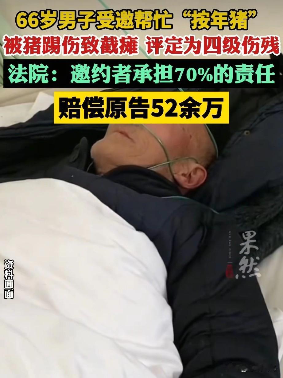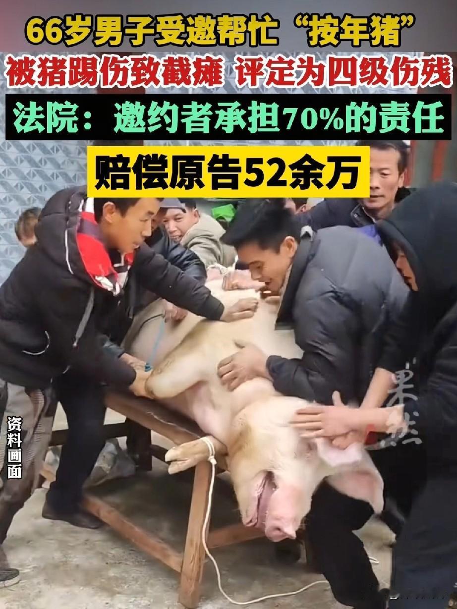 太危险了!合川呆呆妹看了这个新闻一定会后背发凉!原来请人帮忙按猪也是一件风险很大的事! 1月14日,红星新闻记者在中国裁判文书网上看到了一件因为杀年猪引起的纠纷案。 2024年年末,春节将至,四川合江县都有杀年猪的习俗,辛苦劳作了一年的人们把自己养了一年的猪杀掉吃肉是一件十分惬意的事。有人请专门的杀猪匠来办,有的喊上邻居互相帮忙自己杀。 70岁的方某丙,就请了66岁的方某甲来帮忙摁猪。乡里乡亲,方某甲感觉既然人家邀请了自己,是对自己能力的认可,就欣然接受并前往。 天有不测风云,就在方某甲帮忙摁猪的时候,那头几百斤的大肥猪一点也不老实,奋力挣扎,丝毫不认命,它不顾一切的想逃跑,后踢一用力,把方某甲踢到在地。 方某甲已经是66岁的高龄老人,被猪这么一踢,瞬间就感觉天旋地转,瘫倒在地。方某丙等人赶快手忙脚乱的把方某甲送进医院,方某甲四肢已经瘫痪,脊柱骨折,颈椎骨折,经过医生的诊断和观察,最后被鉴定为4级伤残。 身体多处骨折、四肢不能动弹,这可不是小病,需要长时间的治疗与康复。在方某甲住院治疗期间,方某丙断断续续的垫付了8万多元,但是治疗费用远远的超出了8万元,方某甲自己也拿出了更多的钱。 方某甲与方某丙本来是好邻居,但是在如此大的事故面前,又也不得不对簿公堂。 最后经过法院的审理做出判决:邀约者承担70%的责任,需要赔偿被邀约者52万多元。 也就是说,方某丙对方某甲的身体损害承担70的责任,需要赔付给方某家52万多元。方某甲自己操作不当或者没有预见到危险的发生,对事故发生有30%的责任。方某丙已经垫付了8万多元的医药费,还要再付给方某甲43万多元。 这是一个两败俱伤的结果,方某丙想省下请杀猪将的几百块,最后花了52万,方某甲想好心给人帮忙,最后自己身体受到伤害,还要自掏腰包20多万。 一头年猪随随便便几百斤,没有经验的人根本按不住,还是请专业人员操作靠谱,既省心又安全。 前几天重庆合川的呆呆妹在网上说自己家要杀猪,爸爸年龄大按不住,希望有人帮忙,没想到几千名网友闻声而至,上演了一场声势浩大的刨猪汤大事件。 从现场的视频看,帮忙摁猪的都是年轻人,猪踢的很紧张,人摁的很欢乐。没有什么意外发生,皆大欢喜。 热闹过后,呆呆妹肯定也后怕,那么多人,但凡有点小的事情发生,她这个组织者就脱不了干系。 呆呆妹的刨猪宴很成功,这几天陆续有后来者继续举办,希望每一次大家都注意安全,都平平安安的,吃的放心玩的开心才是大家的初衷。