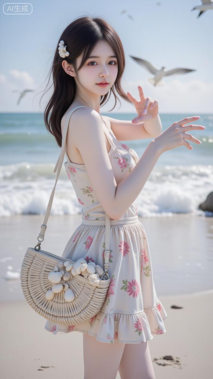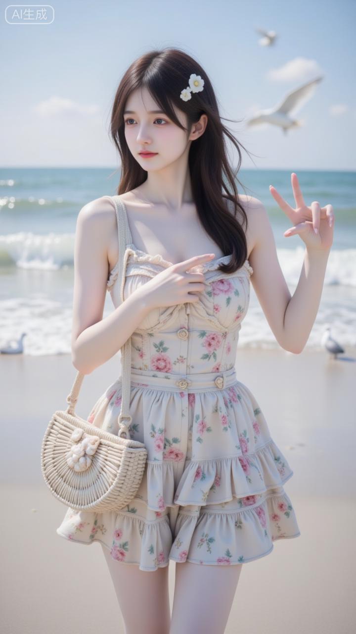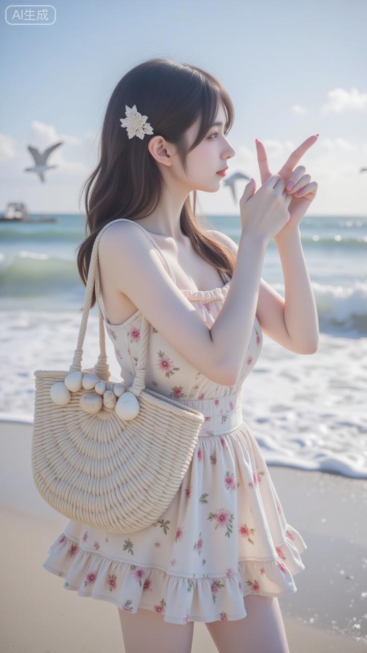 海边的碎花甜妹太戳审美啦 奶杏碎花裙衬得软甜又清新,发间小花和草编包刚好添了松弛感~连海浪与海鸥都成了她的温柔背景板✨ 是把“夏日氛围感”焊在身上的妹妹!海边碎花裙