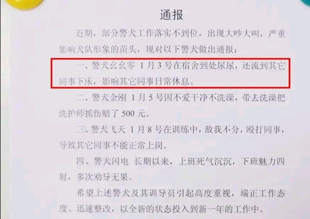 近日,云南省楚雄州公安局警犬训练基地发布一则特殊通报,对4只存在行为问题的警犬予以点名批评。通报中“在战友床铺便溺”“卫生习惯不佳”“工作与业余状态反差明显”等表述,引发社交平台广泛关注。 通报显示,被点名的“幺幺零”“金刚”“飞天”“闪电”4只警犬,因大声吠叫扰乱秩序、行为规范有待提升等问题,影响犬队整体管理。网友虽以轻松视角调侃其“可爱”,但据基地民警介绍,这些警犬实则是各有专长的业务骨干:“幺幺零”适应山地搜捕环境能力突出,“金刚”水中追捕技能迅猛,“飞天”可在百余个包裹中精准识别可疑物,“闪电”则因亲和力强深受群众喜爱。 其中,警犬“幺幺零”诞生于2024年中国人民警察节前夕,为功勋警犬后代,因特殊寓意得名。经过一年系统训练,它继承父母搜救追捕与嗅觉敏锐的优势,顺利通过考核成为专业搜捕犬。训练期间,“幺幺零”因“带头争斗”“在战友床铺便溺”等问题连续四周被通报,让训导员倍感压力,但它执行任务时却高度可靠,能迅速响应警铃指令。 在第五个中国人民警察节来临之际,“幺幺零”迎来一周岁生日。训导员与战友为其准备蛋糕时,对讲机突然传来出警指令,它当即叼起训练用“警服”,前往集合点警车旁待命,这一幕尽显其职业素养。截至目前,“幺幺零”已独立参与2起实地救援、4起嫌疑人追捕行动。未来,这些“无言的战友”将继续坚守一线,以专业能力守护社会平安。