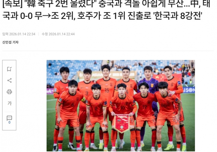 韩媒标题为:韩国足球两度饮恨与中国对决遗憾落空(中国0-0战平泰国获小组第二澳大利亚头名晋级将与韩国会师八强战)