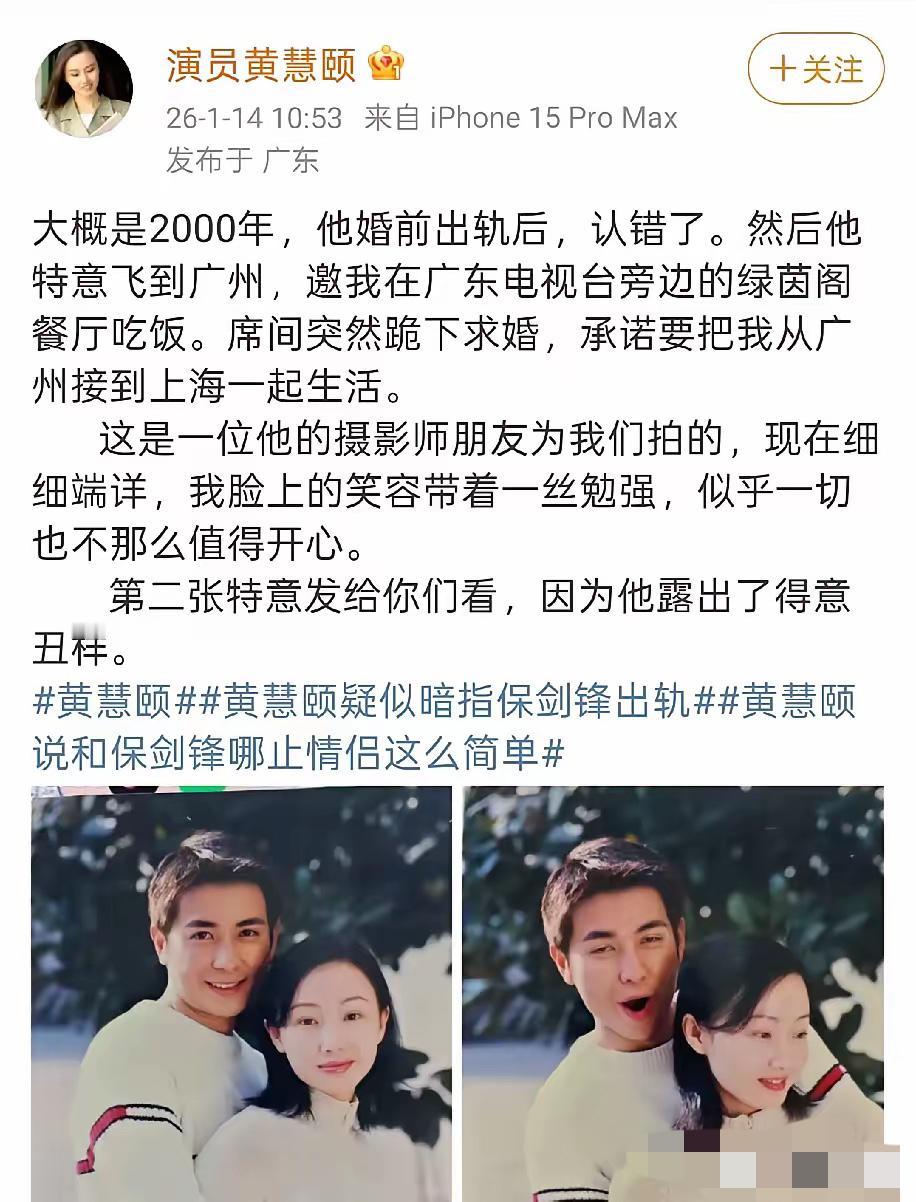 保剑锋会不会凉凉了呢? 黄慧颐说他2000年婚前出轨,认错了。 所以说他俩后来是