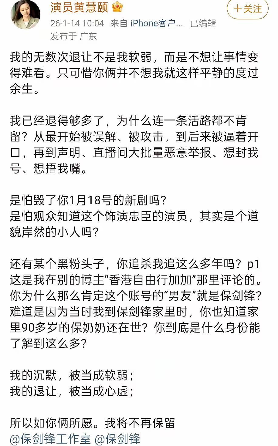 保剑锋会不会凉凉了呢? 黄慧颐说他2000年婚前出轨,认错了。 所以说他俩后来是结婚了吧。 作为一个网友, 这么多年好像也没刷到过黄慧颐的新闻, 不知道为什么保剑锋和他老婆, 一直对黄慧颐这样, 各过各的不好吗? 干嘛对一个已经离婚不想干的人这样? 还有黄慧颐说最大的黑粉其实就是保剑锋, 如果她说的是真的, 那保剑锋这个人挺可怕的啊! 自己出轨、离婚了还一直对前妻这样。 当然现在这些只是黄慧颐的一面之词, 就看她有没有证据了, 如果没有证据保剑锋应该没啥事, 如果有铁证, 那保剑锋的事业肯定会受到影响。 大家怎么看这件事, 是觉得保剑锋就是这样的人, 还是觉得黄慧颐无中生有。