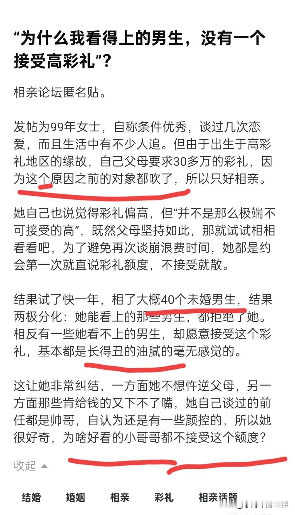 99年女孩:“为啥我看得上的男生都不接受高彩礼?” 那为啥我看得上的公司,都不愿意给我高薪酬? 这个女孩说父母定的彩礼是30万,一年内,她相亲约40个男孩,结果却是两极分化,她看上的男孩都不愿意出这个彩礼,她看不上的男孩却愿意接受这个彩礼。 我看她不是不懂,而是装不懂。 她看上的那些男孩,她自己都说了是帅哥,也就说明这些男孩子人家本身很优秀。人家也是挑选的一方,而不是被挑选的一方。既然如此,人家肯定会挑选符合自己价值的女孩,显然她在这些帅哥眼里的价值不值30万。 现在的某些女孩在相亲市场上,总以为自己是独一档,自己是挑选的一方,男孩是被挑选的一方。殊不知,真正优秀的男孩,又会有几个剩下的,又会有几个到相亲市场来挑选自己的另一半? 那些优秀的男孩,早已被身边的人挑走了,哪还轮得到相亲市场。彩礼 婚姻彩礼观