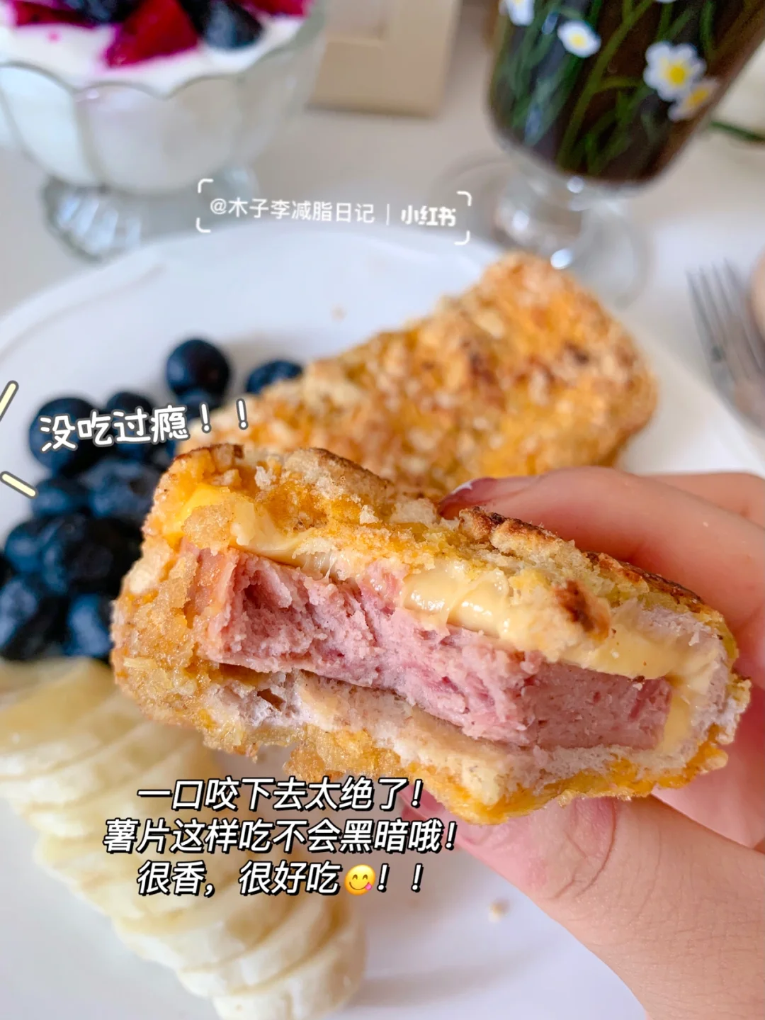 📣:薯片和吐司是个什么神仙搭配!这也太好吃了吧😋吐司放上午餐肉和芝士片在裹上低脂薯片直接煎就可以连烤箱都不用!咸香酥脆!巨好吃!低卡低脂又解馋~