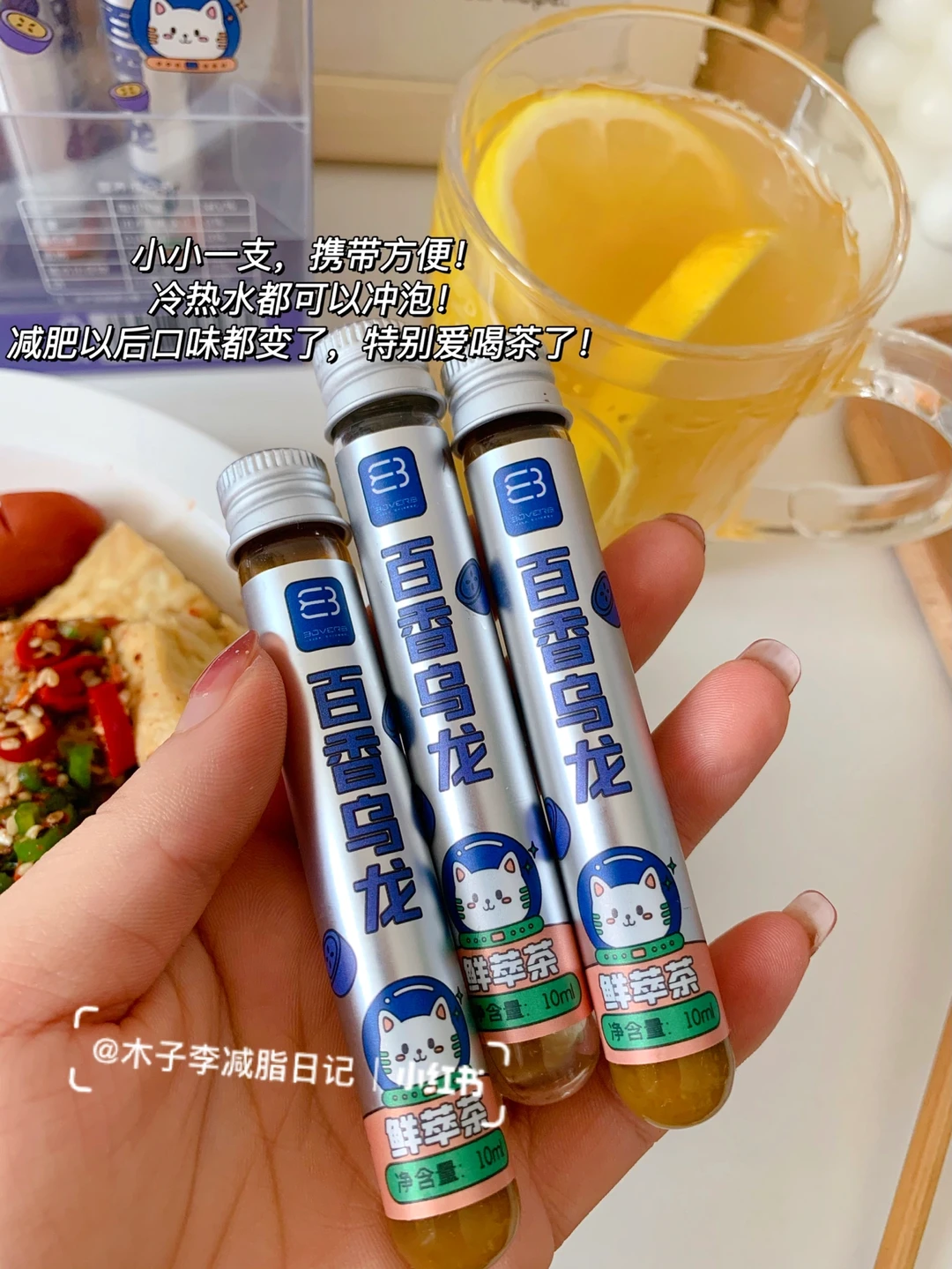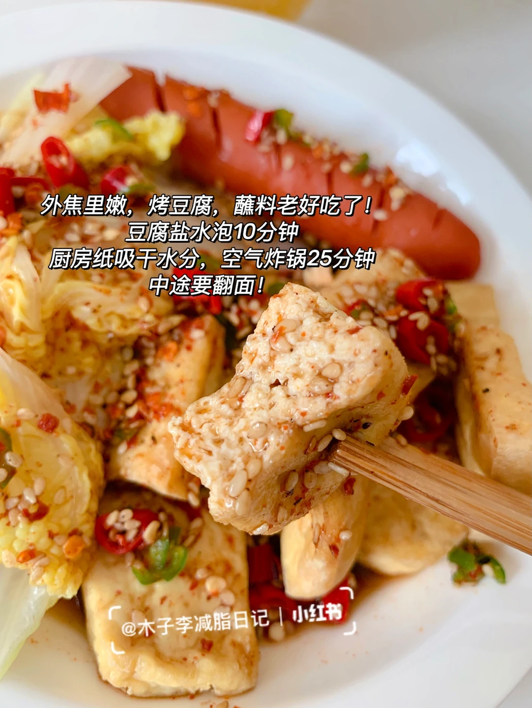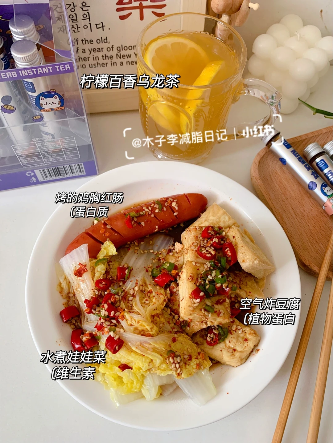 🥙午餐:乌龙百香柠檬茶➕空气炸豆腐➕鸡胸红肠➕娃娃菜