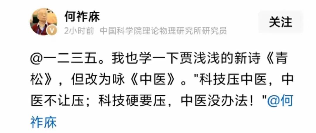 何祚庥与中医有深仇大恨? 何祚庥最近迷上了浅浅湿,并仿淫了一首《中医》∶ “科技压中医, 中医不让压; 科技硬要压, 中医没办法。” 何祚庥是著名的中医黑,以往多次抹黑中医。一个当过院士的人,虽然不一定算是科学家,或科学工作者,但起码从事过与科学研究相关的工作吧,怎么在对待中医这件事情上,不管三七二十一就全盘否定,没有丝毫科学精神和态度呢? 听说何祚庥年轻时曾经得了啥病,西医治不好,还是颠颠地跑到中医那里看好的呢。如果情况属实,何祚庥就真是个惯于过河拆桥的人。 何祚庥黑中医,似乎纯粹属于信仰问题,或曰屁股问题。因为迷信西医,或由捧西医而获利,就把屁股坐在西医一边,而对于与西医生意存在一定程度竞争的中医大肆攻击。就是说,何祚庥黑中医,是屁股决定了脑袋和嘴巴。 何祚庥用蹩脚的歪诗抹黑中医,其实违背了基本的事实。医学是实践的学科。中医有几千年的医疗实践背书,本来无需现代科学来解释。何况,现在的中医也把现代科技成果应用到了病情诊疗过程中。事实上,完全不存在“科技压中医,中医不让压”的问题。 因此,何祚庥的歪诗,根本就是颠倒是非,混淆黑白。喜欢浅浅湿,你尽管天天意淫好了。对中医冷嘲热讽,真是有辱院士二字。