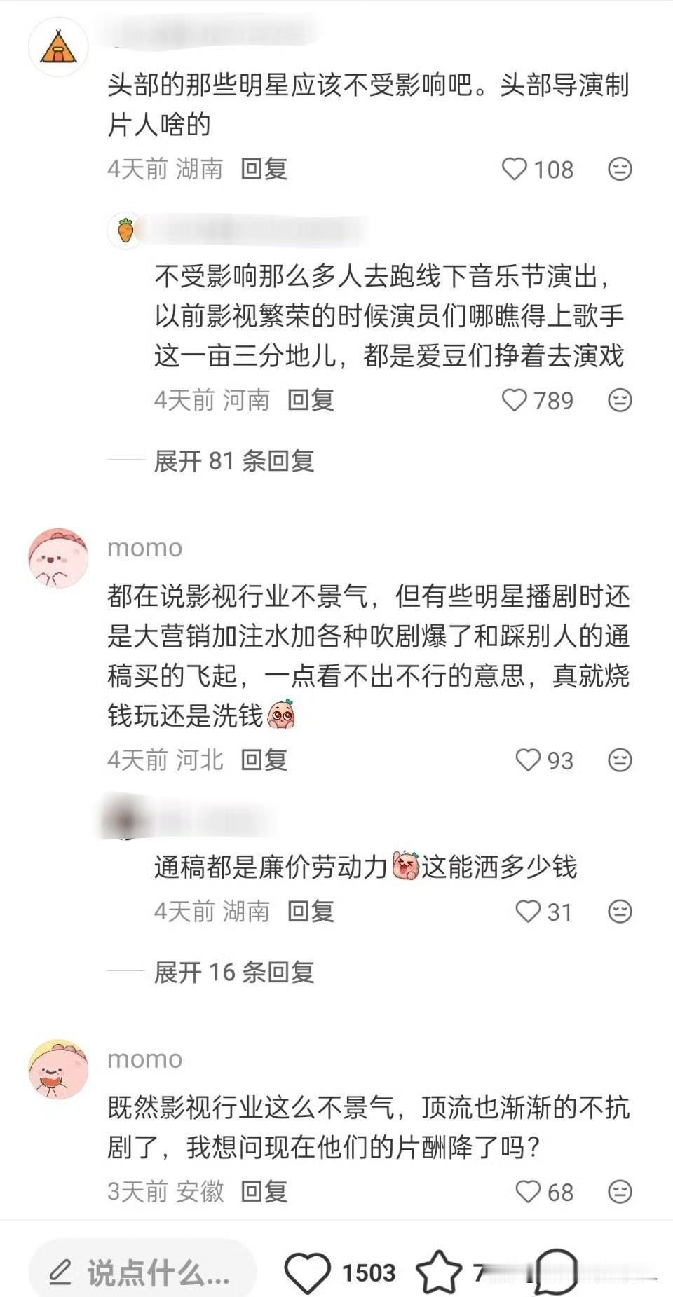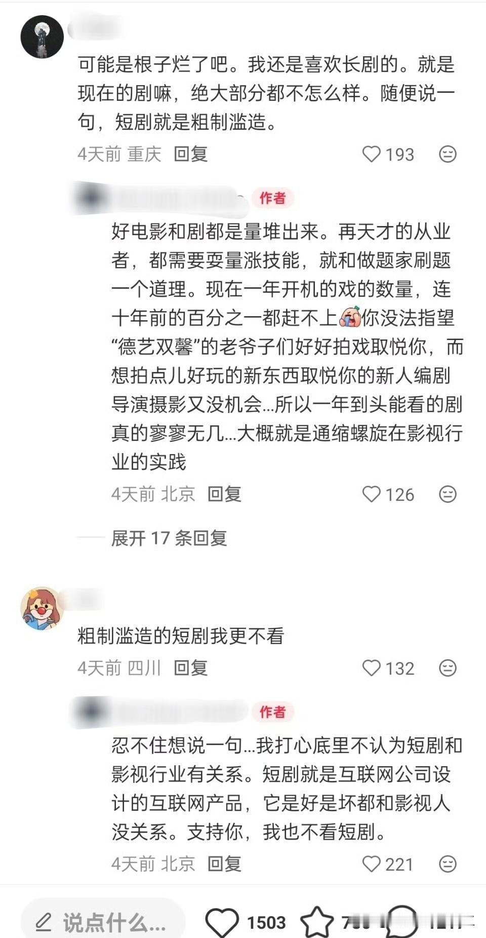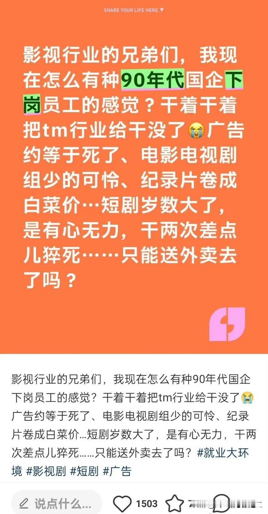 有干影视圈的网友发帖 影视行业的兄弟们,我现在怎么有种90年代国企下岗员工的感觉?干着干着把行业给干没了,广告约等于死了、电影电视剧组少的可怜、纪录片卷成白菜价…短剧岁数大了,是有心无力,干两次差点儿猝死……只能送外卖去了吗?