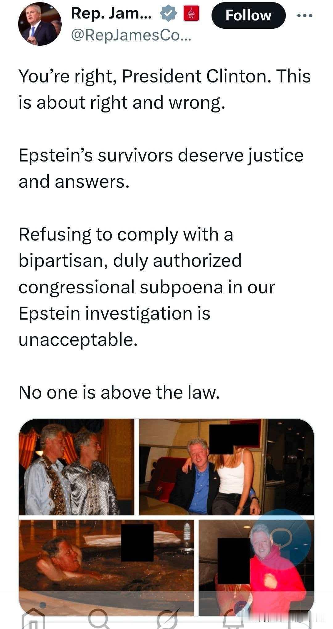 重磅新闻!美国前总统克林顿与其妻前国务卿希拉里1月13日拒绝出席众议院针对已故性犯罪富豪艾泼斯坦案的闭门听证会,公开挑战监督委员会主席、共和党众议员柯默( James R . Comer )的传唤,恐将因此遭到"藐视国会"指控。