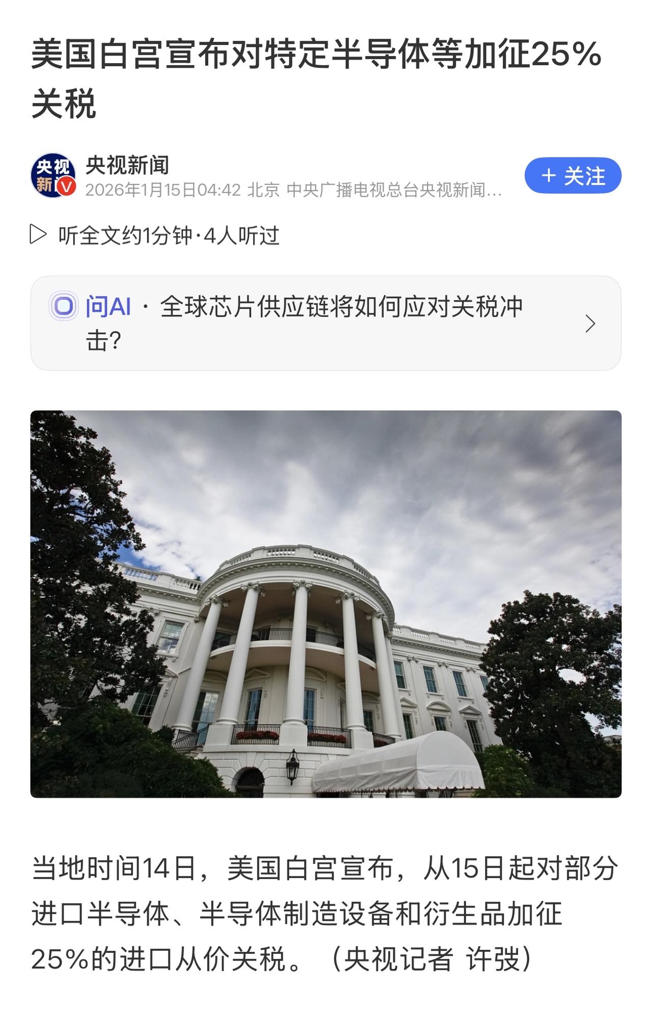 美国此次对进口半导体加征25%关税的决定显得较为突然。这直接改变了原来将半导体关税提至50%的计划。