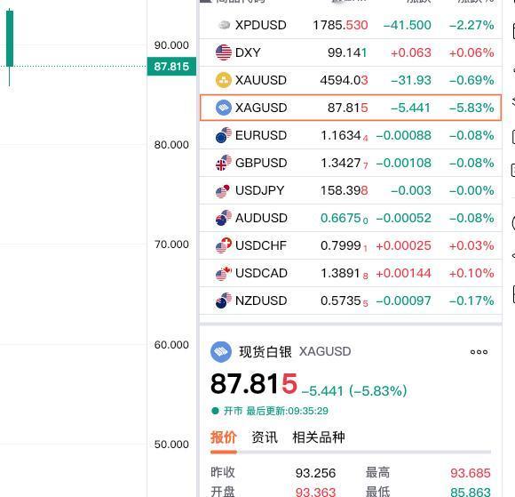发生了什么? 白银大幅跳水! 昨晚现货白银突破93美元, 很多人欢天喜地,以为马上到100。 结果今天就来了一个急刹车! 现货白银高开低走,快速暴跌。 盘中最低跌至85.863美元, 现在报价87.815美元, 较上一日下跌5.441美金, 跌幅现在缩小为5.83%。 对于白银, 期货小褚观点不变, 暴涨就有大回调的行情出现, 观望为主比较好!