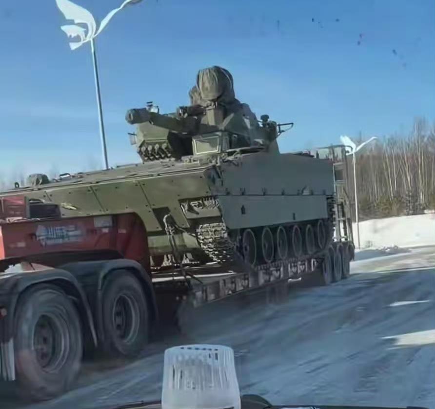 解放军04B步兵战车有点像战争雷霆里面的幻视9040,图中被重型拖车转场,背景气候证明可能在搞寒区测试。 采用6对大直径负重轮,寒带适配款履带,模块化装甲设计可灵活加挂适配防护模块,炮塔侧面能看到观瞄窗口轮廓,主炮看起来是换成新30mm。