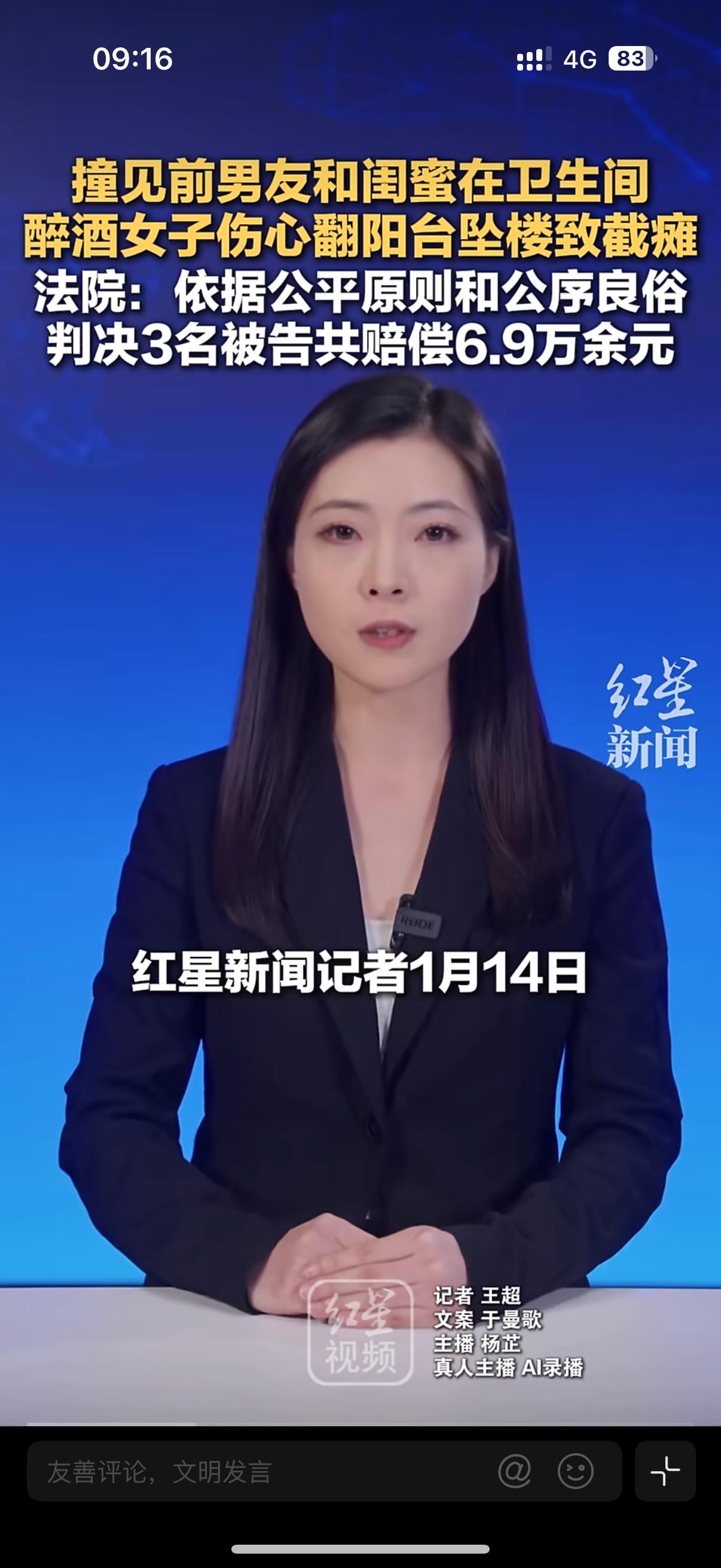 闺蜜和前男友在自己家卫生间独处,醉酒女子撞见后跳楼截瘫,同桌喝酒的三人到底该担多大责?这件事最近吵翻了天,法院的判决更是让大家议论纷纷。 女子和前男友刚分手一个月,那天晚上跟闺蜜、前男友还有另一个朋友一起喝了酒,之后回到自己的出租屋。她先回卧室休息,后来出来上厕所,看到闺蜜和前男友在卫生间里,觉得两人举止亲密,一下子就情绪崩溃了,跑到阳台翻过围墙跳了下去,最后双下肢截瘫,后半辈子都得靠人照顾。她把这三个人告上法院,索赔一百多万,结果法院判三人不用承担侵权责任,但要补偿6.9万元,相当于总损失的5%。 法院这么判是有道理的,毕竟三人已经把她安全送回了家,也没有劝酒、吵架这些过激行为,她跳楼是自己情绪失控后的选择,作为成年人得对自己的行为负责。但为啥又要补偿呢?说白了就是出于公平和人道主义,大家毕竟是朋友,还一起喝了酒,现在出了这么大的事,让当事人一个人扛下所有也太残忍了。这就让人想到,酒桌上的情谊从来都不只是推杯换盏那么简单,一起喝酒就意味着多了份隐形责任。平时我们总说“感情深一口闷”,可真要是喝出了事,所谓的“感情”可能就变成了甩不掉的责任。 傻不傻呀!就因为一时的情绪上头,用一辈子的健康去惩罚别人的过错,这笔账怎么算都不值。生活里谁还没遇到过糟心事儿,被背叛、被辜负确实让人难受,但再大的委屈也不能拿自己的生命开玩笑。身体是自己的,一旦出了问题,最痛苦的还是自己和家人,那些让你伤心的人,可能过不了多久就忘了这事儿,照样过自己的日子。所以说,情绪失控的时候真得给自己踩个刹车,别让一时的冲动毁了一辈子。 有人觉得既然没劝酒、没犯错,就不该赔钱,这不是“和稀泥”吗?也有人觉得一起喝酒就该互相照应,不能不管不顾。其实法律已经说得很清楚了,强迫劝酒、明知对方不能喝还劝、没安全护送回家、不劝阻危险行为,这几种情况才要担责。但法律之外还有人情,朋友之间相处,多一份关心、多一份留意,可能就能避免一场悲剧。酒局的意义是联络感情,而不是埋下危险的种子。 这件事既有法律上的边界问题,也有情感上的选择问题。如果你是当事人,遇到这种情况会怎么处理?如果你是共饮者,又会怎么做?欢迎在评论区说说你的看法。 来源:红星新闻