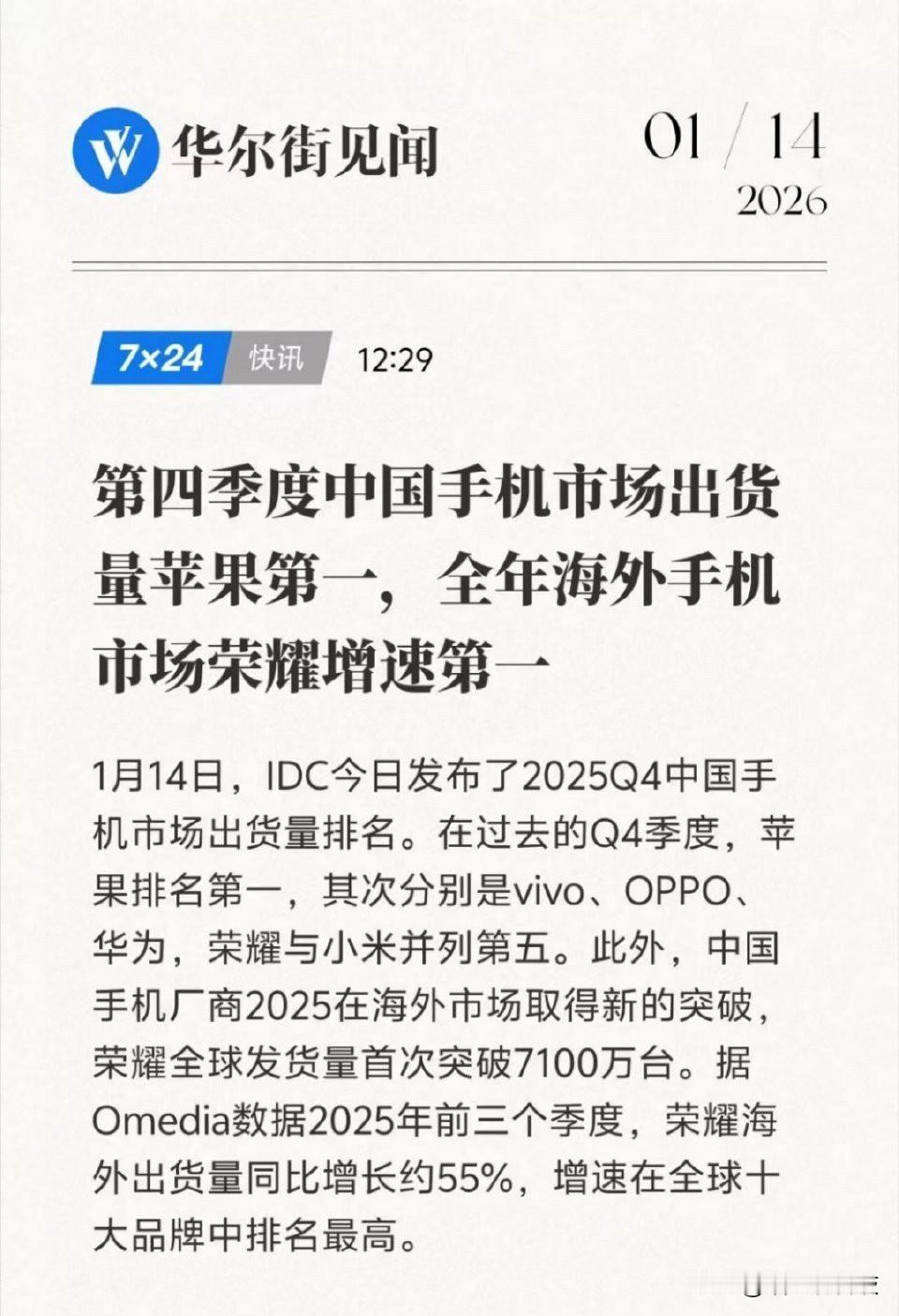 华为荣耀两兄弟,这是国内国外两开花啊~ 华为凭借着全年4670万台的出货量(份额16.4%),重返市场第一; 而荣耀则是全球总出货量高达7100万台,海外销量同比增长47%,占全球出货量比例首次突破50%。 华为拿下国内第一还是不太让人意外的,毕竟今年新机节奏相当快,而且mate80系列、Nova15系列都卖的相当不错。 但没想到的是荣耀在海外市场的布局居然这么牛,短短几年拿下如此成绩,看来“海外先发、国内特供升级”模式还是挺优秀。 其实个人觉得荣耀近期的新机都还挺不错的,不知道为啥国内的销量就是没起来呢?