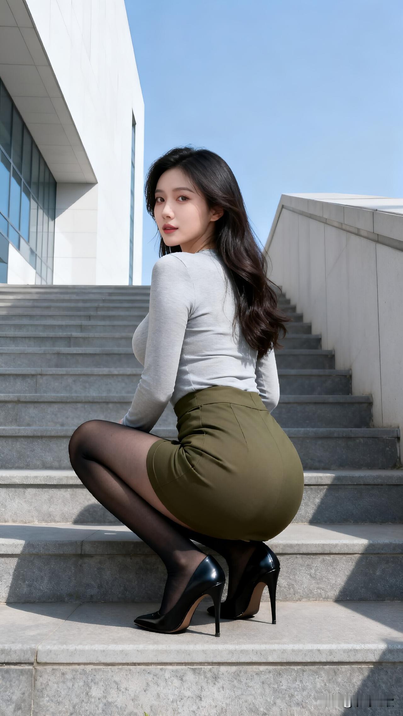 灰衣配军绿裙太绝了!职场风穿搭也能美出高级感 谁能拒绝职场风女神的魅力?现代建筑的石阶旁,女神身着灰色修身长袖上衣搭配军绿色高腰短裙,冷白皮在低饱和度配色的映衬下更显通透,修身上衣勾勒出流畅的上身线条,高腰短裙搭配黑丝与高跟鞋,将极致的身材曲线和职场女性的干练气质展现得淋漓尽致。 她蹲坐在石阶上,回头的瞬间眼神清冷又妩媚,乌黑长卷发垂落肩头,背景的极简建筑与蓝天形成高级的视觉对比,职场风与性感完美融合。这样的职场穿搭是不是瞬间戳中你的审美?你觉得这组造型的高级感能打多少分? 职场风穿搭 灰绿配色 黑丝搭配 冷白皮女神