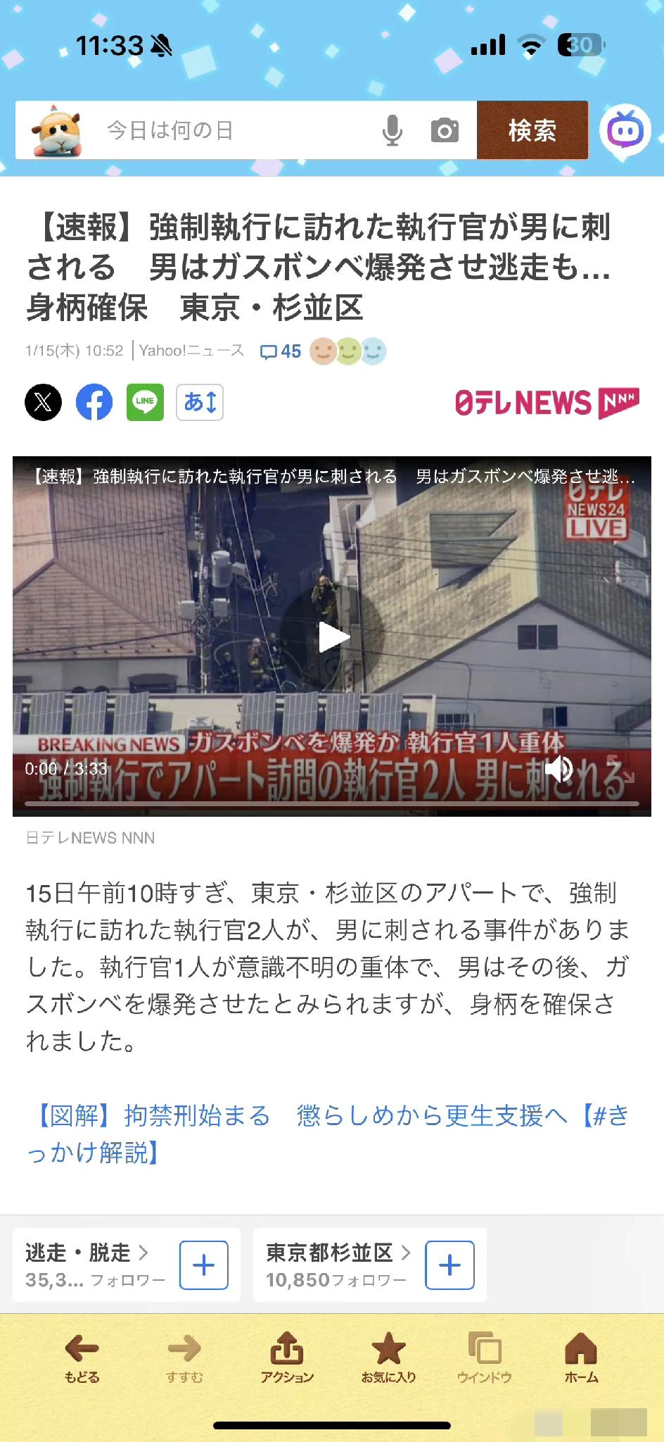 我去日服现在这么猛了吗? 今早10点东京都衫并区,俩法院工作人员对一处出租屋进行赶人的强制执行,但住户持刀捅了法院的人(2人都被捅了)并引爆了瓦斯罐(卡司炉用的那种)后逃跑 现在犯人抓到了,法院的人一个重伤(目前没有意识)一个轻伤 海外活动执行 海外条友说 海外新鲜事
